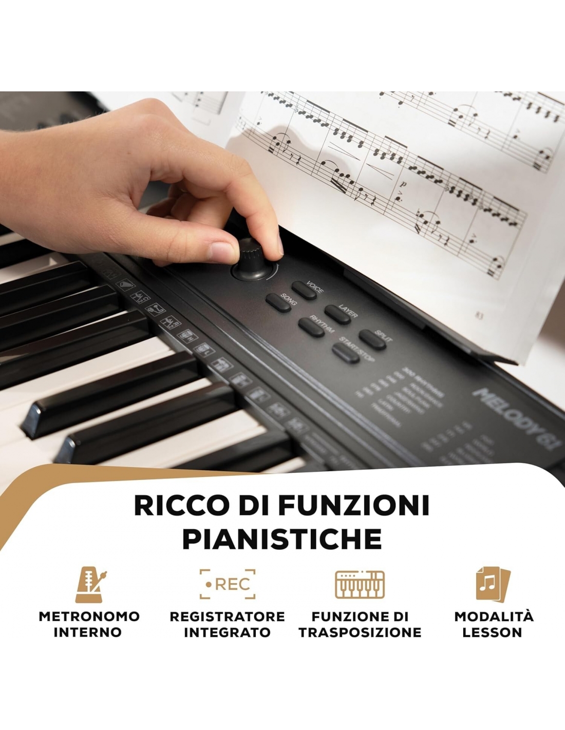 Tastiera per pianoforte Alesis Melody 61 con 61 note per principianti con altoparlanti, supporto, sgabello, cuffie, leggio, 300 suoni e lezioni di musica