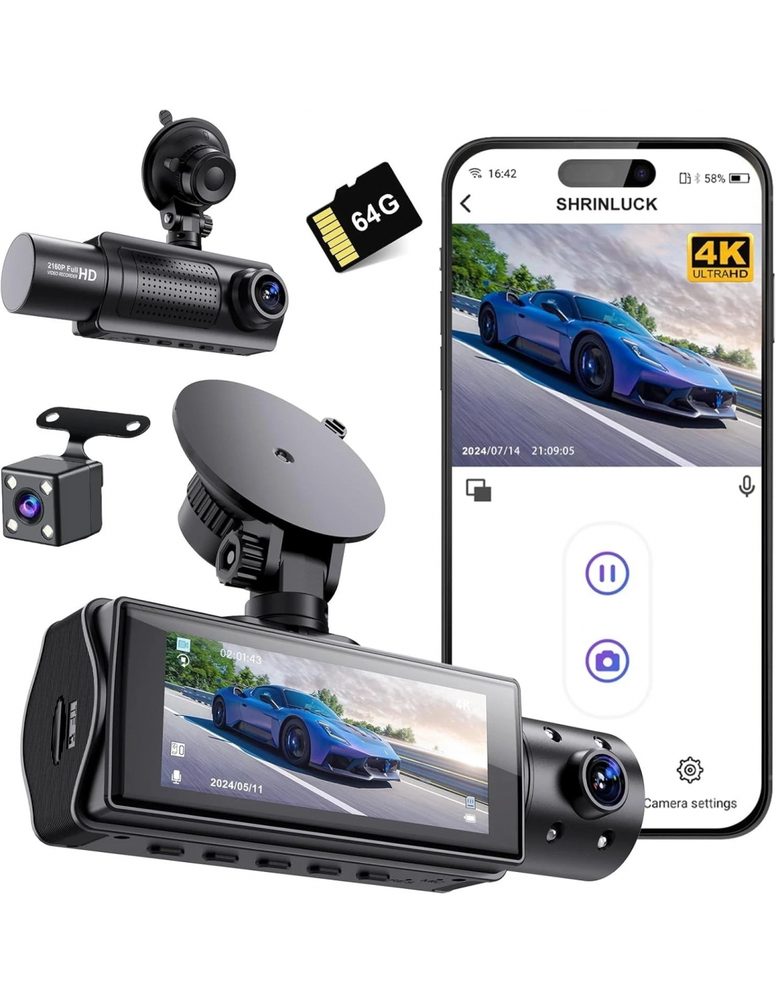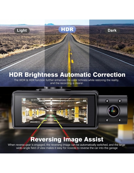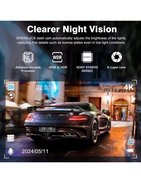 - SHRINLUCK ti offre la dash cam X5 anteriore e posteriore all'interno, che può registrare video frontale Ultra HD 4K + video interno 1080P + video posteriore 1080P. La dash cam auto SHRINLUCK X5 può aiutarti a leggere i dettagli chiave come i segnali stradali e le targhe dei veicoli in modo più chiaro, offrendoti un migliore piacere di guida e una maggiore sicurezza. Questa telecamera auto è dotata di una fotocamera frontale grandangolare da 176° e di una fotocamera interna e posteriore grandangolare da 160°, registrando tutto ciò di cui hai bisogno.