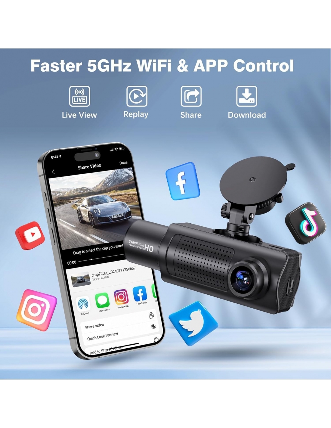 - La dash cam auto senza fili SHRINLUCK X5 è dotata di un modulo di connettività Wi-Fi a 5 GHz aggiornato per fornire un trasferimento dati Wi-Fi più veloce per un'anteprima, un download e una condivisione video fluidi. Puoi accedere facilmente ai video registrati, guardare streaming live, configurare la dashcam auto, scaricare e condividere i tuoi video sui social media direttamente dal tuo smartphone tramite APP. E puoi condividere i tuoi scenari di viaggio e i momenti più belli con i tuoi amici e familiari con un solo clic.