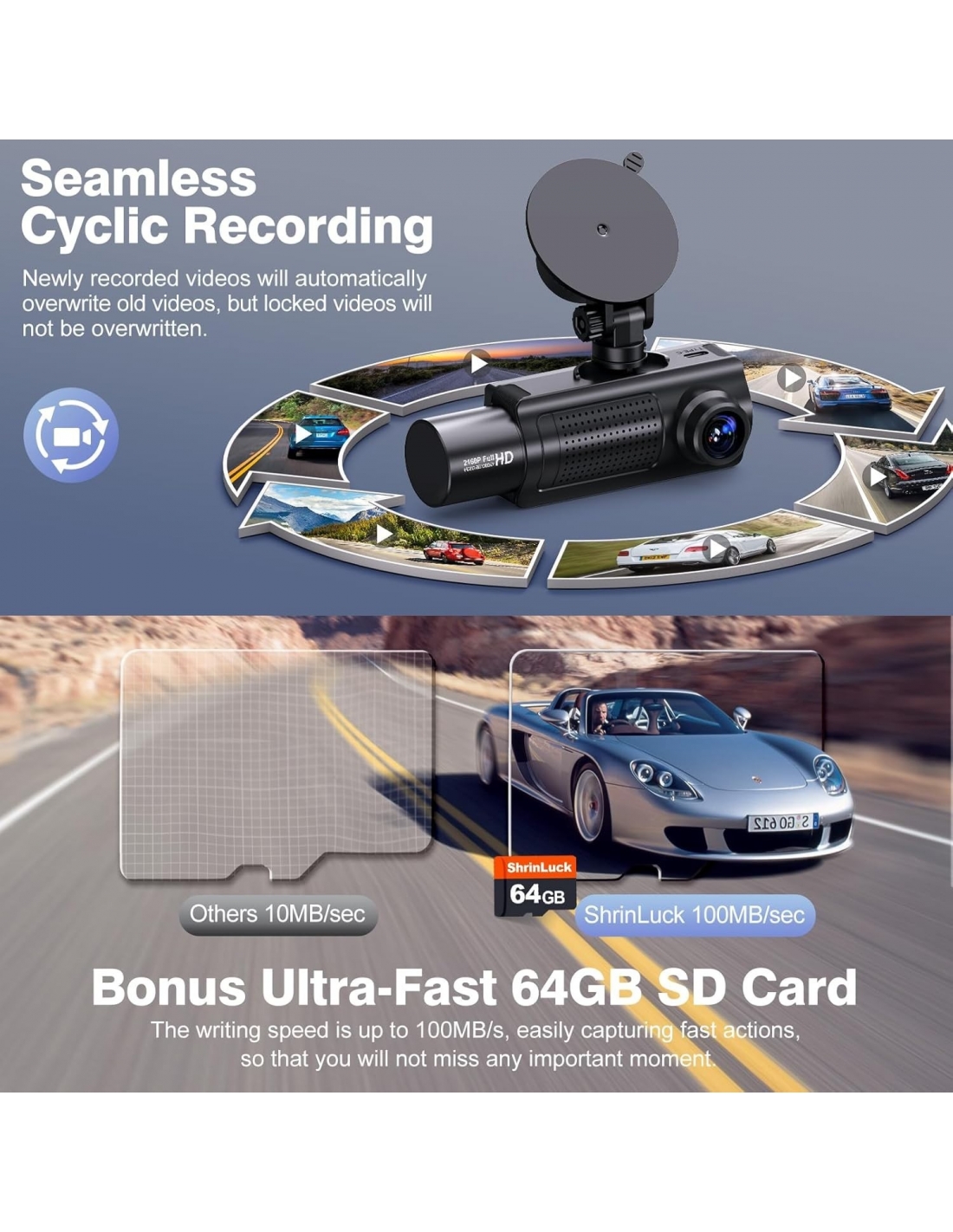 - La telecamera auto SHRINLUCK X5 supporta la registrazione ciclica, sovrascrive automaticamente i vecchi file video quando lo spazio di archiviazione è insufficiente per garantire che la registrazione video continua non venga interrotta. Le dashcam SHRINLUCK per auto risolvono il problema del video registrato con intervalli di tempo, fotogrammi chiave mancanti, attraverso innovazioni tecnologiche, è possibile realizzare una connessione continua tra il video ciclico per preservare meglio le prove video.