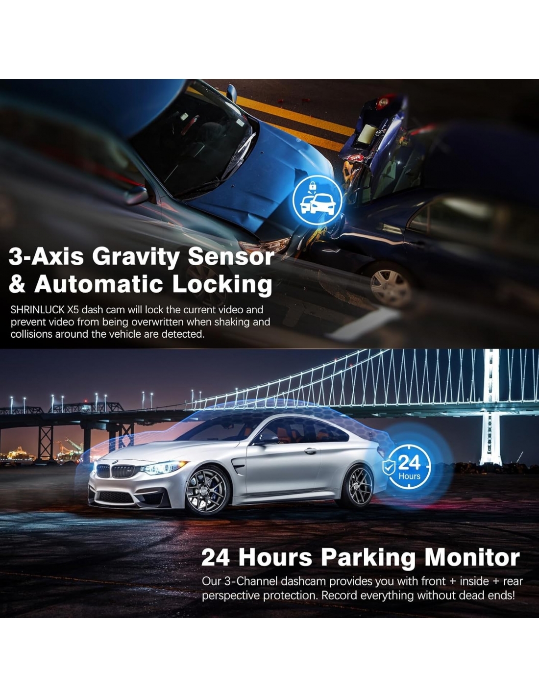 - Le dash cam auto SHRINLUCK per auto sono dotate di un sensore G a 3 assi ad alte prestazioni aggiornato e la sua sensibilità realizza un ulteriore aggiornamento. Quando si verifica una collisione con un veicolo, la nostra dash cam auto senza fili SHRINLUCK X5 registrerà automaticamente il video durante l'incidente, salverà e bloccherà il video corrente come prova. Ti consente inoltre di affrontare più comodamente potenziali problemi di sicurezza come furti d'auto, danni dolosi alla tua auto, incidenti mortali e altro ancora!