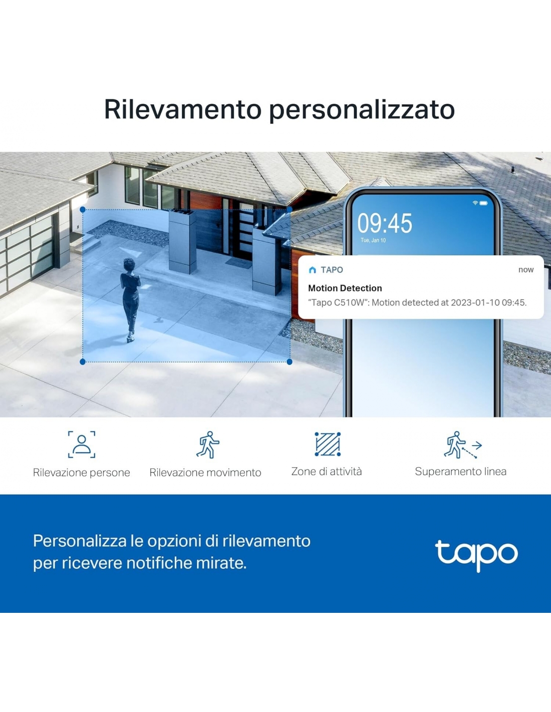 - Smart Motion Tracking-Tapo C510W tiene traccia del movimento con rotazione ad alta velocità, assicurandoti di tenere d'occhio le aree più vitali.