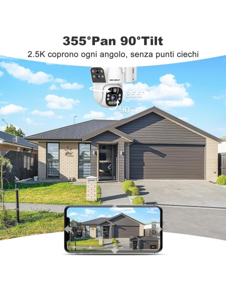 - [Doppia lente e doppio schermo] La telecamera wi-fi esterno presenta un design a doppia lente per una copertura completa, senza punti ciechi. La telecamera bullet superiore è fissata in un punto per fornire una difesa grandangolare. La telecamera dome PT può ruotare di 355°/90°. In questo modo è possibile visualizzare una stessa area o due aree diverse allo stesso tempo utilizzando una sola telecamera.[Rilevazione PIR Intelligente e Difesa Luminosa] Questa telecamera esterno senza fili con pannello solare all'aperto con sensore PIR può rilevare oggetti intorno ai 37ºC (98,6F°) e inviare immediatamente notifiche quando si verifica un evento PIR. Inoltre, in modalità luce bianca, una volta attivato l'allarme di notte, i faretti si accendono automaticamente per spaventare l'intruso e inviare immediatamente un messaggio al telefono.