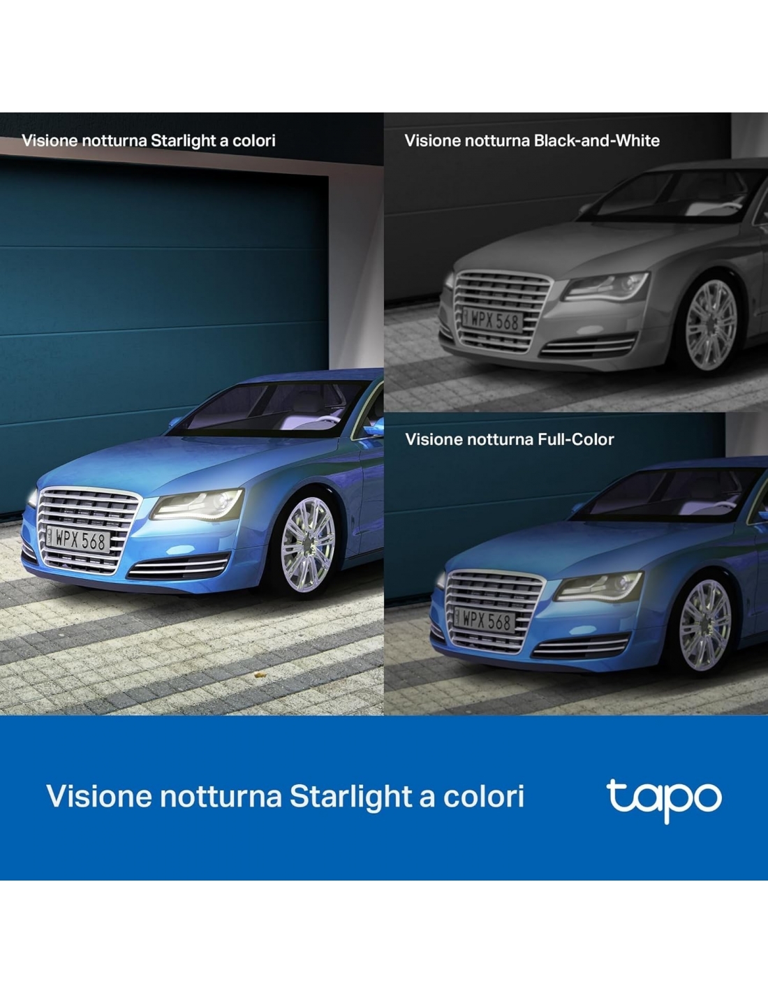 - Visione notturna a colori Starlight: adottando un obiettivo ad ampia apertura F1.6 e un sensore starlight, Tapo C520WS cattura più luce e ha una maggiore fotosensibilità, rendendo così i colori più luminosi in condizioni di scarsa illuminazione rispetto alle telecamere per la visione notturna a colori con un obiettivo F2.2 e sensore ordinario.