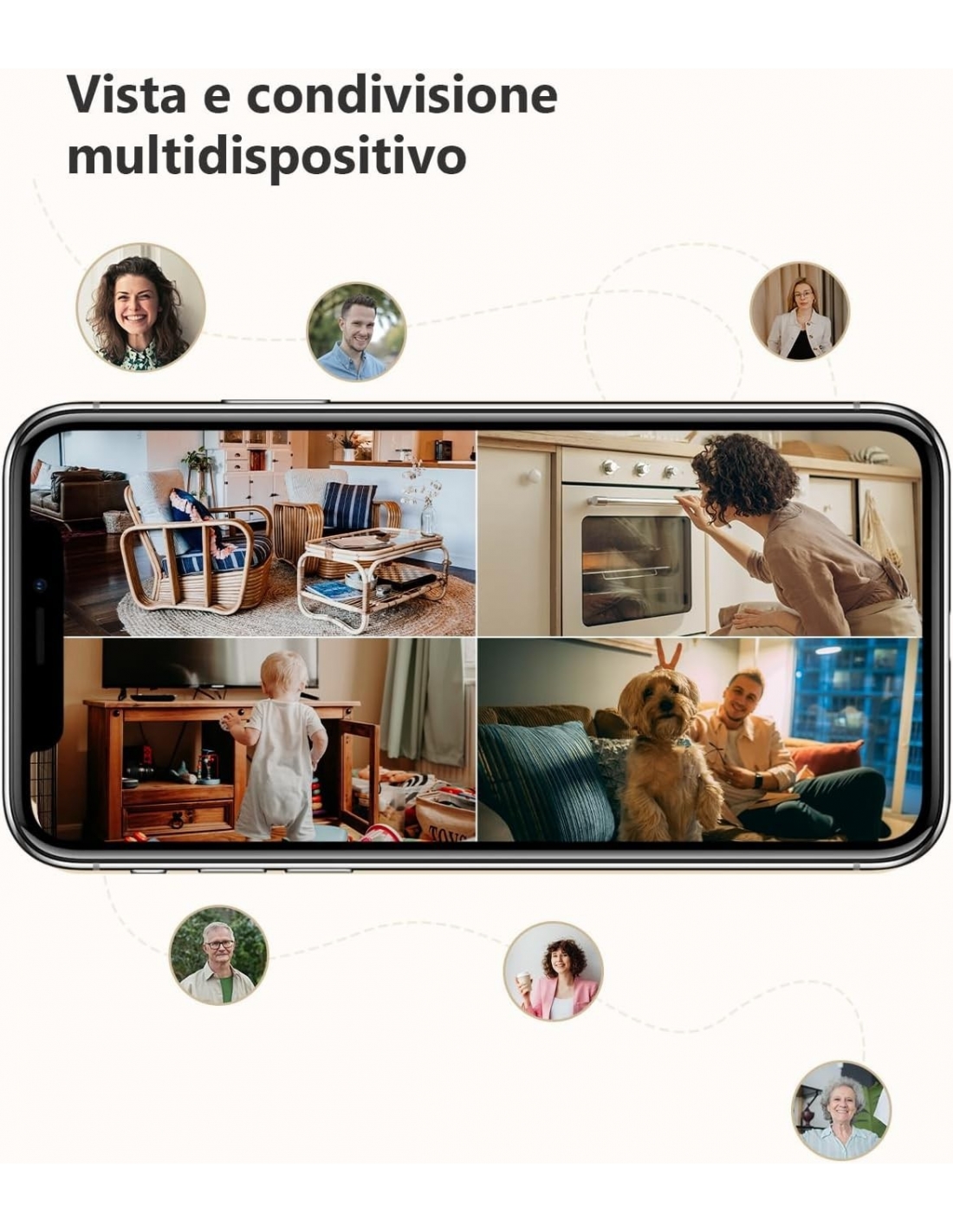 - 【Audio Bidirezionale & Condivisione degli Utenti】 In questa telecamera per interno troviamo un microfono integrato ed un altoparlante ad alta potenza che consente di ricevere i suoni in modo chiaro e confortare il nostro bambino o animale domestico, indipendentemente da dove ci troviamo. Abbiamo anche la possibilità di condividere il video con la nostra famiglia e con gli amici(Mas. 6 persone).