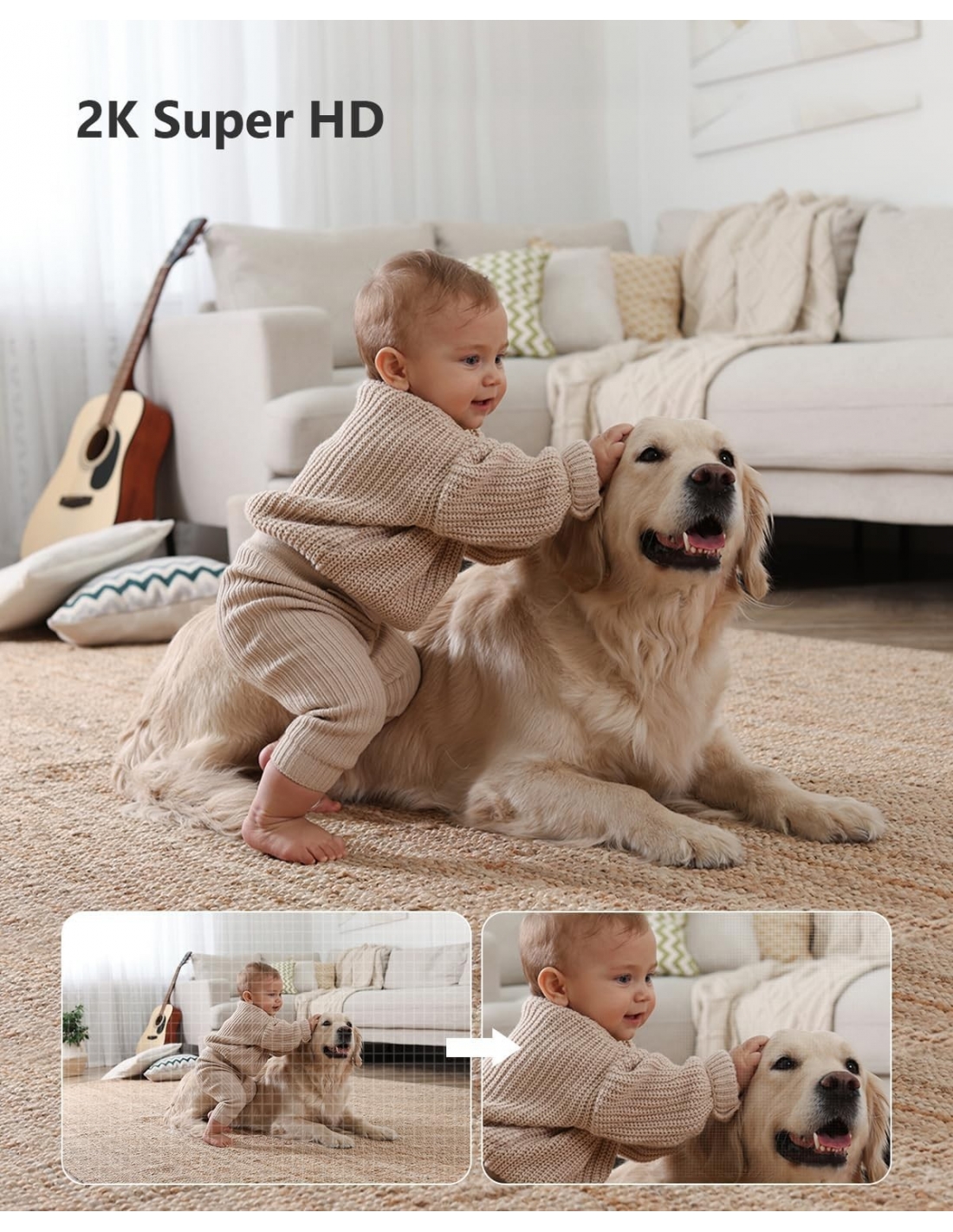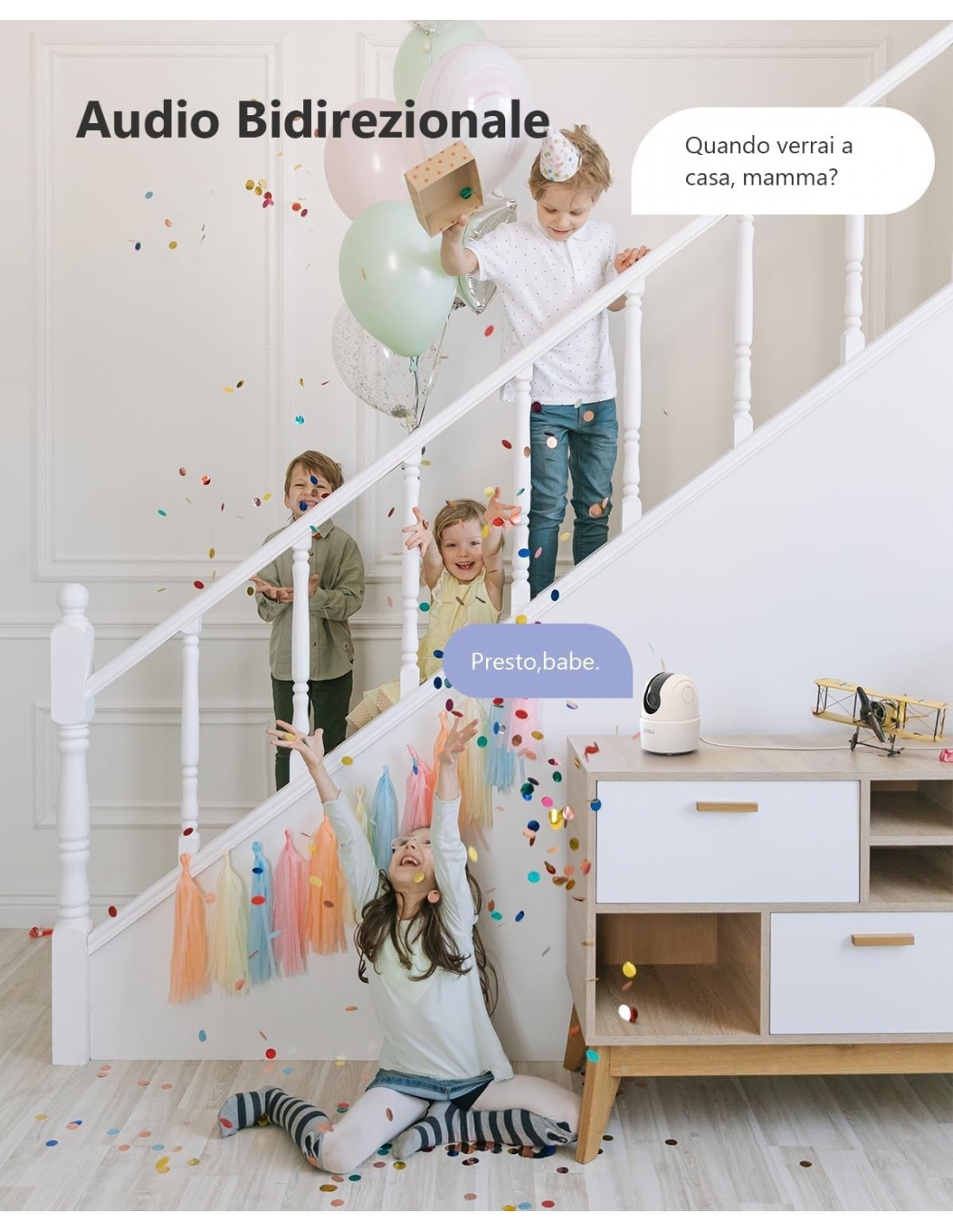 - 【Altissima Risoluzione 2K & Vista Panoramica a 360°】 Con una risoluzione altissima da 3MP, questa telecamera wi-fi interno presenta colori reali di oggetti e consente di visualizzare immagini nitide e super chiare in streaming video live. È progettata con una rotazione orizzontale di 355 ° e verticale di 85 ° per creare una copertura completa a 360 °.