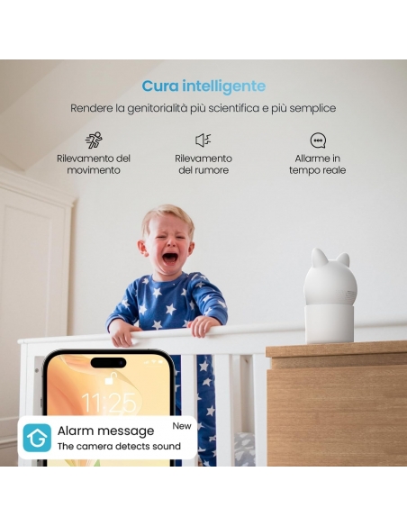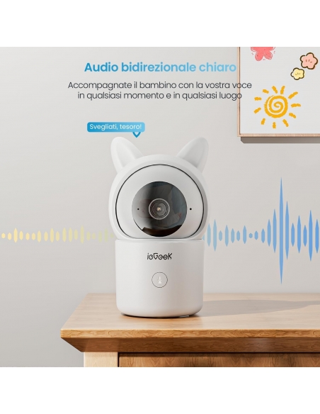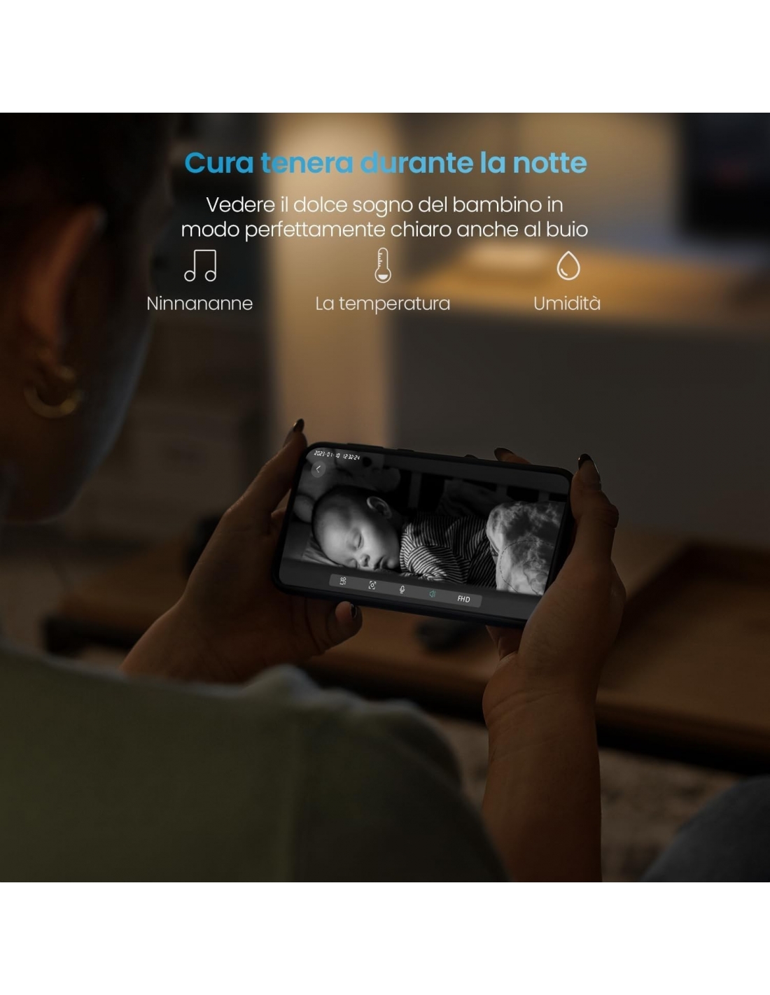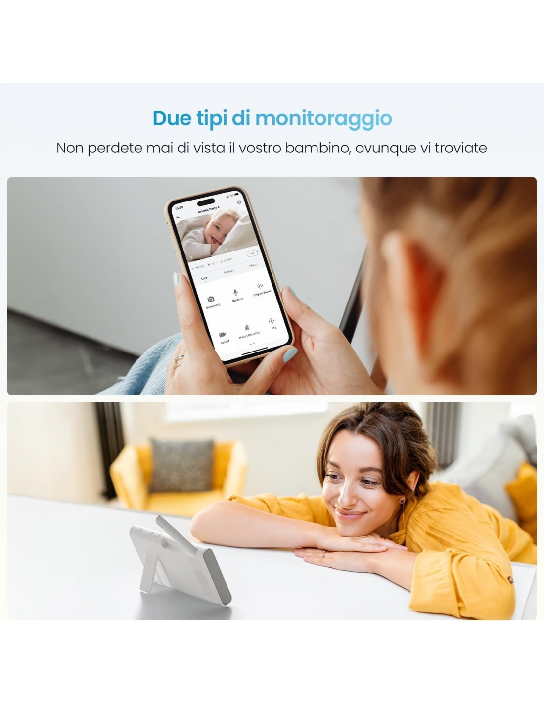 - Sorveglianza completa: mantieni il controllo completo sull'ambiente del tuo piccolo grazie al nostro baby monitor con 2 telecamere per la stanza, con panoramica a 355° e inclinazione a 100° per una copertura completa. Goditi lo zoom 4x e le funzionalità avanzate di tracciamento automatico con la telecamera del nostro baby monitor, per catturare ogni momento con vividi dettagli.