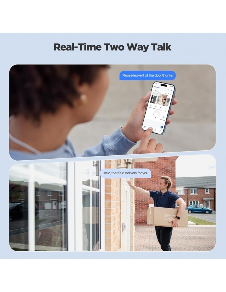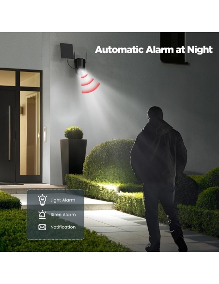 - 【Allarme luminoso e sonoro】È possibile impostare la telecamera wireless esterna per emettere un suono di allarme acuto per allontanare intrusi o piccoli animali indesiderati. La telecamera wireless esterna può emettere automaticamente un suono quando si attiva un allarme di movimento. È anche possibile pronunciare un comando vocale premendo manualmente l'icona del microfono nell'app. Mentre si lascia che la telecamera emetta automaticamente un allarme, si prega di fare attenzione a non disturbare i vicini. Il sistema di sicurezza domestico.
