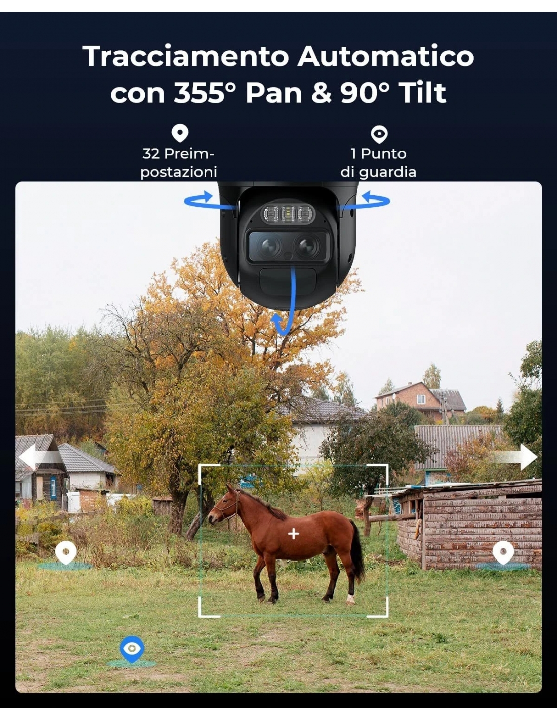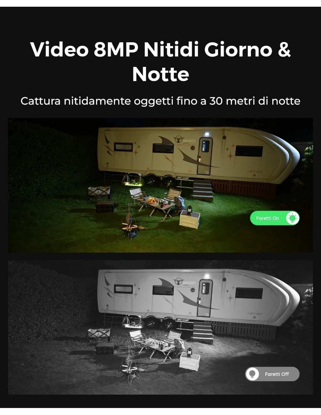 - 【Video 4K nitidi giorno e notte】Con l'alta risoluzione 8MP, il doppio obiettivo cattura nitidamente i dettagli. Di notte, fornisce visione notturna a infrarossi in bianco e nero
