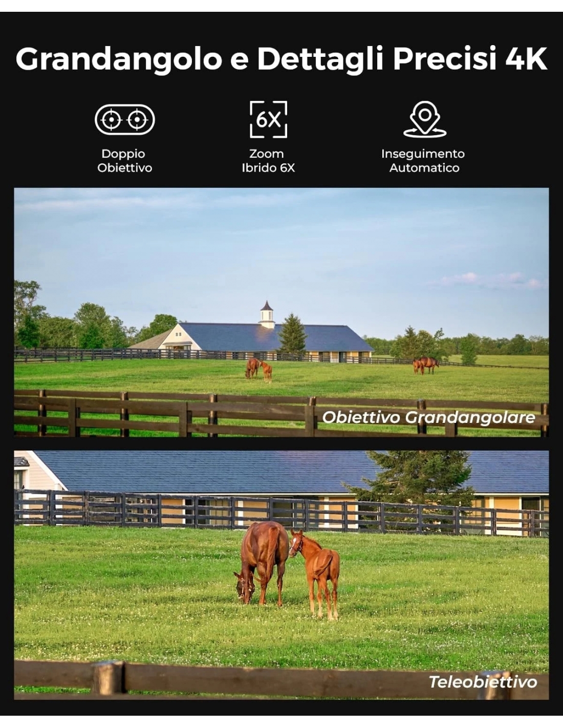 - 【Doppia visualizzazione su uno schermo】Con lo zoom ibrido 6X abilitato dal grandangolo e dal teleobiettivo, questa telecamera sim 4G ti offre una visione completa e un primo piano dei dettagli chiave su uno schermo. Puoi vederli entrambi a colpo d'occhio