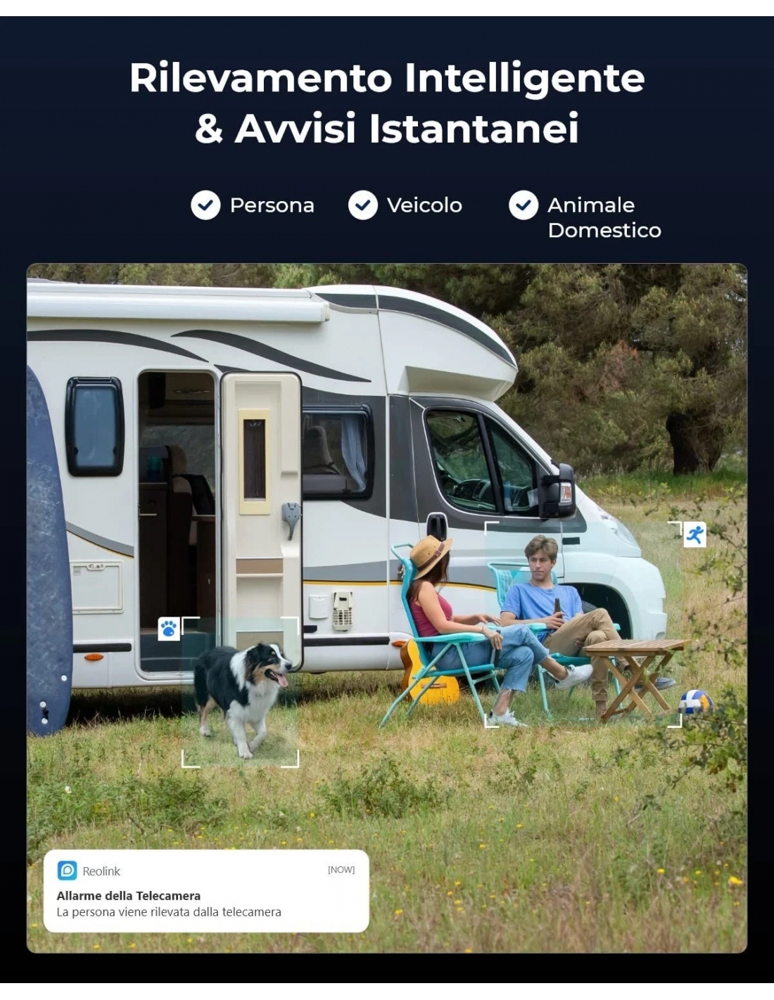 - 【Ricevi avvisi su ciò che conta in tempo reale】La videocamera di sorveglianza può distinguere persone, veicoli e animali domestici da altri oggetti e fornire avvisi pertinenti. Riceverai immediatamente una notifica tramite e-mail, notifica push o allarme