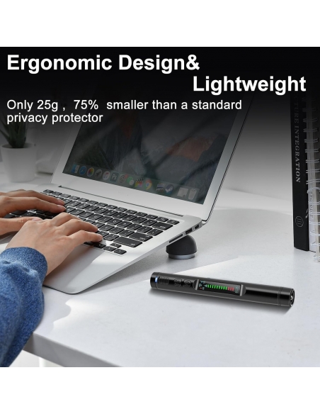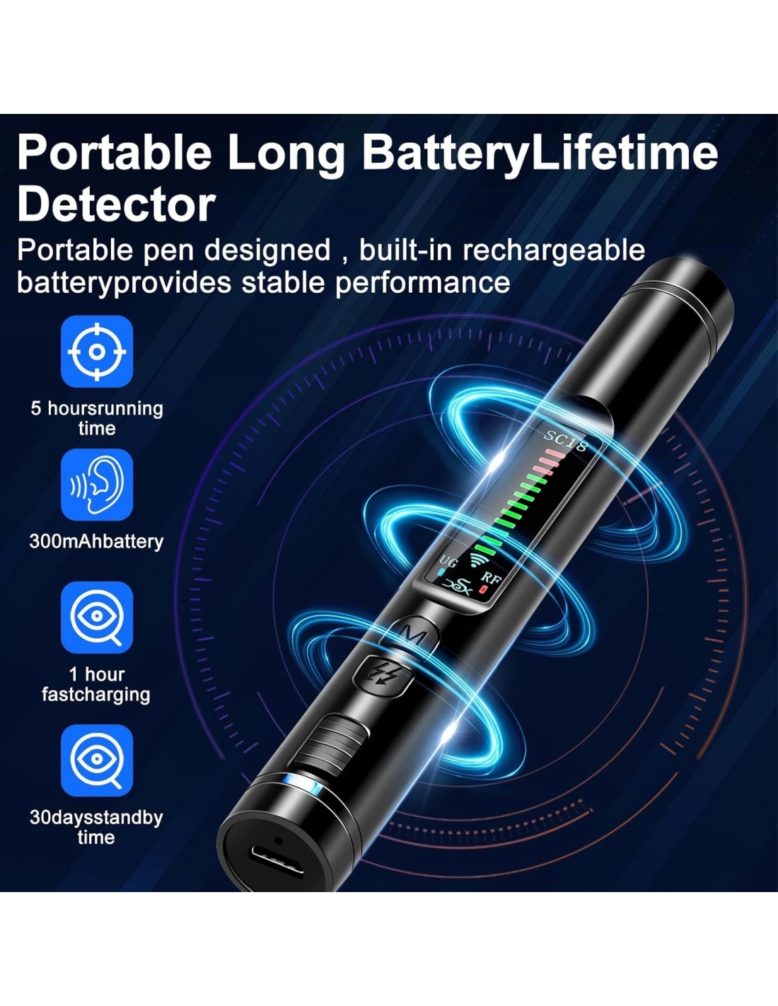 - 【Funzioni Multiple】Il Rilevatore di telecamere nascosta ha 3 funzioni in 1. Rilevamento del segnale RF che consente di rilevare trasmettitori di microfoni RF attivi come microfoni audio wireless. Rilevatore di lenti della fotocamera per individuare telecamere a stenopeo nascoste e telecamere a infrarossi invisibili. Puoi anche usarlo per rilevare traccianti GPS magnetici indesiderati