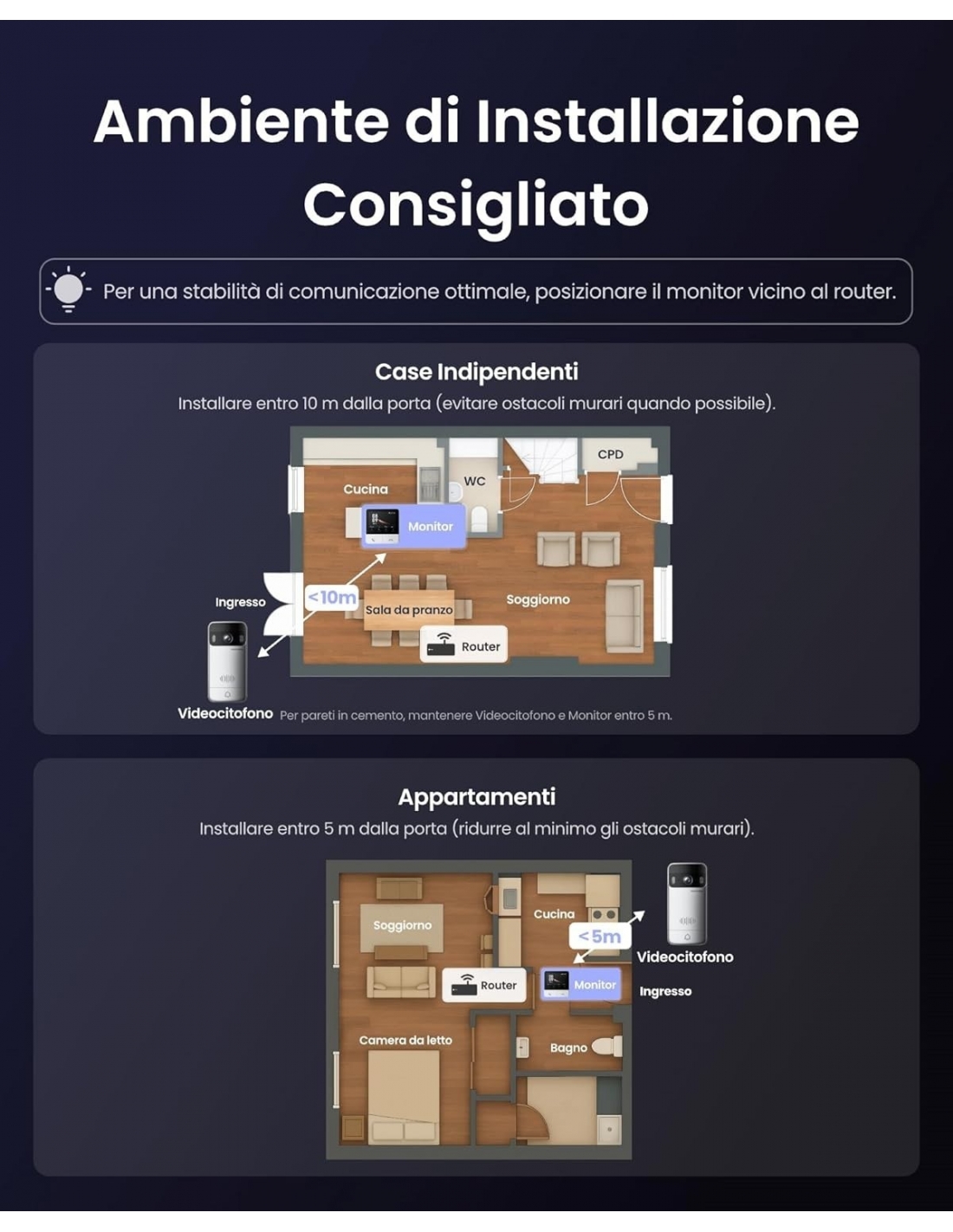 - 【Precauzioni per l'installazione del Monitor】Tenere il monitor interno e il campanello esterno il più vicino possibile. Quando il campanello e il monitor interno si trovano entro un raggio di 5 metri, è garantita una connessione forte e immediata. Ciò assicura che il feed video in diretta sia fluido e che le notifiche siano istantanee.