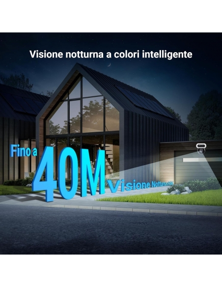 - 【Modalità di Vsione Notturna Fino a 40m】Dotata di un'eccezionale visione notturna a colori, la telecamera di sorveglianza wifi per esterni è arricchita da 4 proiettori integrati per immagini nitide anche nel buio più totale. La telecamera di sorveglianza offre tre modalità di visione notturna per soddisfare ogni esigenza: modalità a colori per la massima chiarezza, modalità intelligente che passa automaticamente al colore quando viene rilevato un movimento e modalità in bianco e nero per una maggiore visibilità in condizioni di scarsa illuminazione. Con un raggio di visione notturna fino a 40 metri.