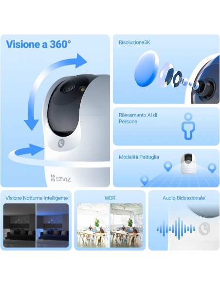 - 【Risoluzione 3K e Visuale Panoramica 360°】EZVIZ La telecamera WiFi C6N G1 3K cattura ogni dettaglio in alta risoluzione 3K, riduce efficacemente la sovraesposizione e fornisce immagini a colori anche in condizioni di scarsa illuminazione. La C6N G1 riprogettata è concepita per vedere molto di più rispetto alla maggior parte delle telecamere sul mercato, con un'angolazione di 350° Pan e 85° Tilt.