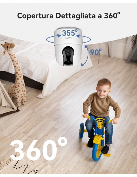 - 【Vista Panoramica a 360°& Allarmi di Suoni Anomali】 Grazie alla copertura del campo visivo orizzontale di 355° e rotazione verticale di 85°, crea una copertura di 360°, possiamo posizionarla dove vogliamo e visualizzare l'intera stanza, e la telecamera da interno invia avvisi istantanei al smartphone ogni volta che rileva un bambino che piange o altri suoni anomali, tenendoci consapevole di quello che sta succedendo a casa.