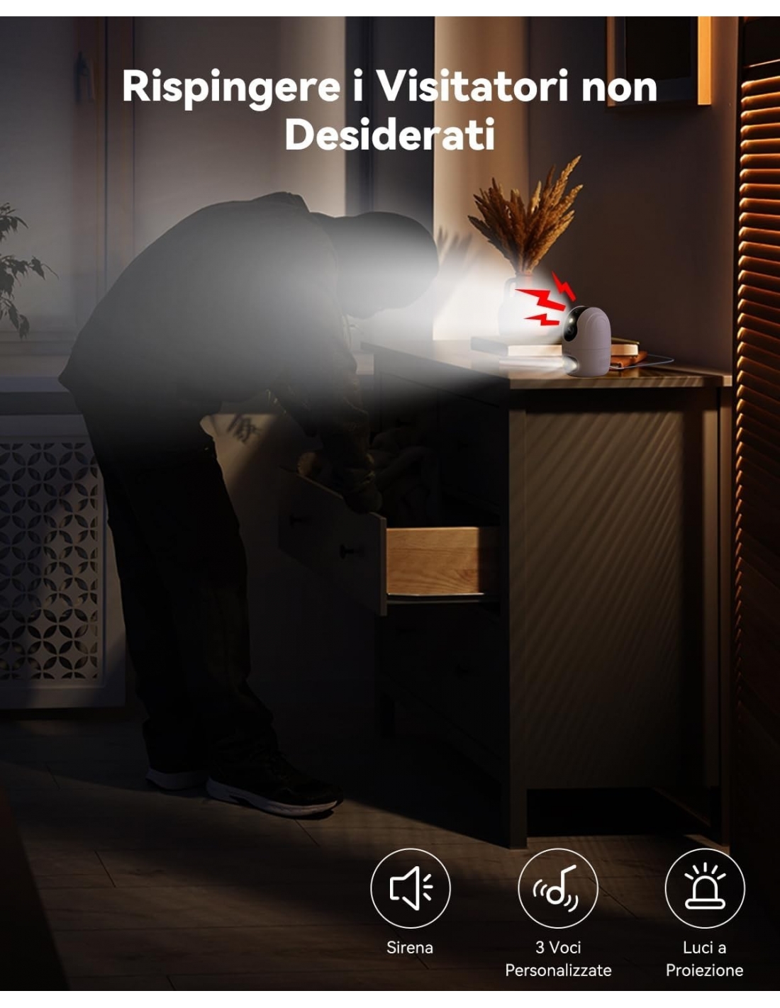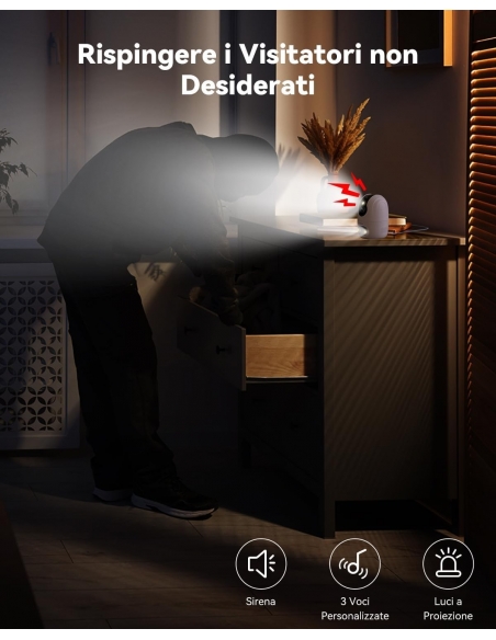 - 【Difesa Attiva con Sirena e Faretto & Modalità Privata】Faretto, sirena e allarme sonoro personalizzabilie(Ci sono 3 cambiavoci incorporati: originale, uomo, robot) per garantire la tua sicurezza quando non vuoi esporre la propria voce! E faI un clic sull'app per nascondere l'obiettivo della videocamera sorveglianza se non vuoi fare la rivelazione di movimento quando a casa.