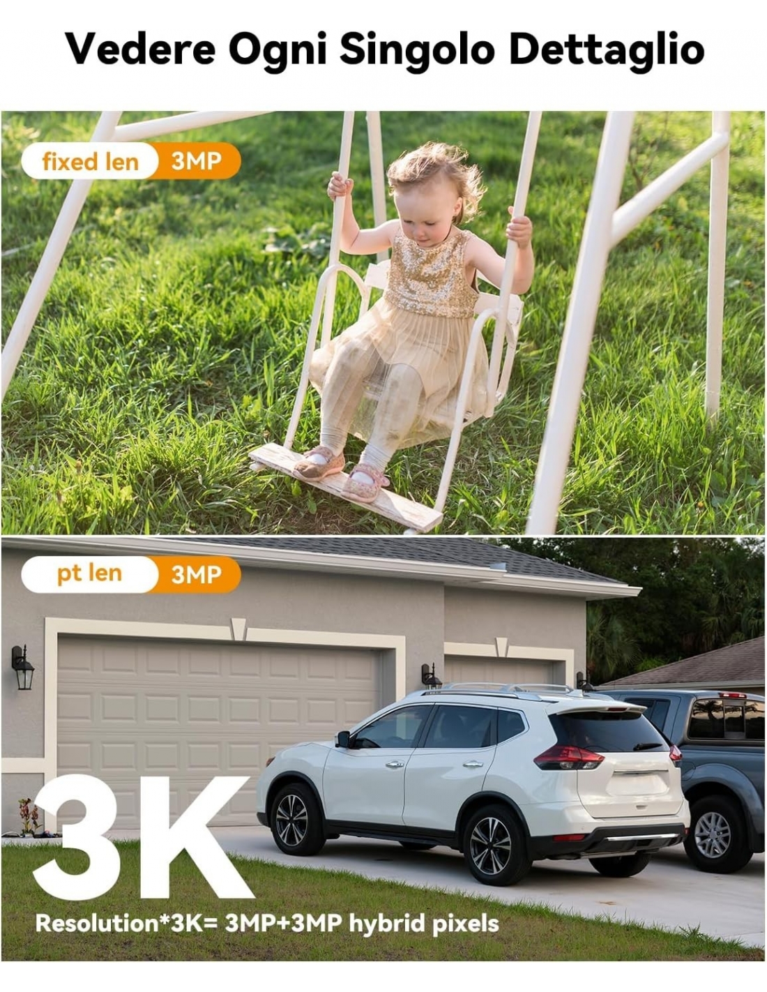 - 【Doppio Obiettivo & Doppio Schermo】 La telecamera wi-fi esterno dispone di due obiettivi, uno fisso 3MP e l'altro rotante 5MP, offrendo un campo visivo a 360 gradi. L'obiettivo grandangolare monitora l'immagine panoramica, mentre il teleobiettivo rende gli oggetti distanti più chiari.