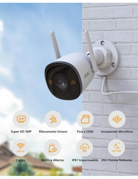 Imou Bullet 2C 2K Telecamera 3MP WiFi da Esterno con AI Rilevazione del Movimento Umano, IP67 Antipolvere & Impermeabile, Visione Notturna 30m, Compatibile con Alexa