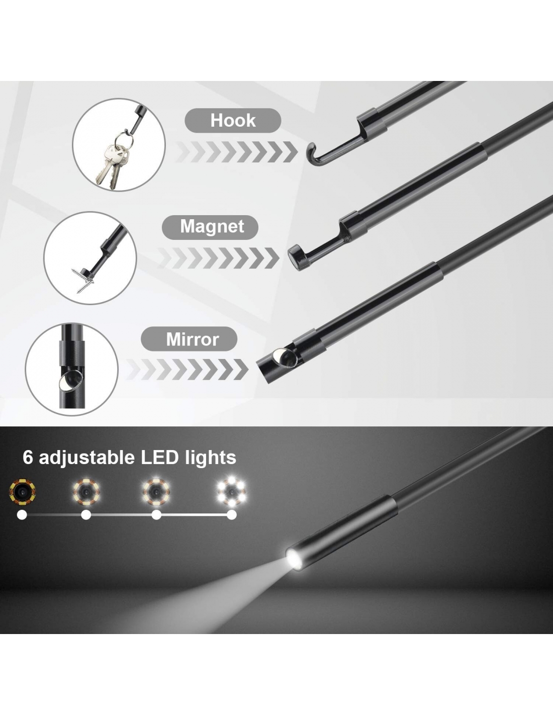 - 【6 luci a LED regolabili】 Con i 6 LED regolabili sulla punta della fotocamera garantisce un'immagine chiara in condizioni di oscurità. Il cavo semirigido da 5 m/5 mm è sia rigido che flessibile.
