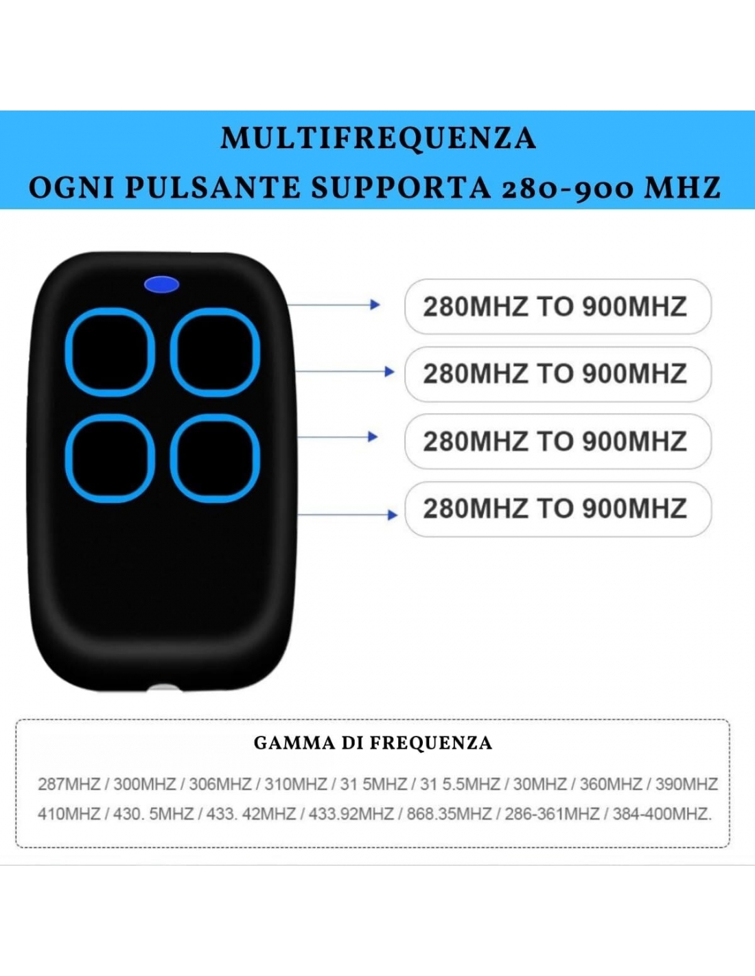 Telecomando Cancello Universale 4 in 1 Rolling Code Multifrequenza da 280 a 868mhz. Radiocomando programmabile Versione aggiornata con Lista compatibilità (Blu)