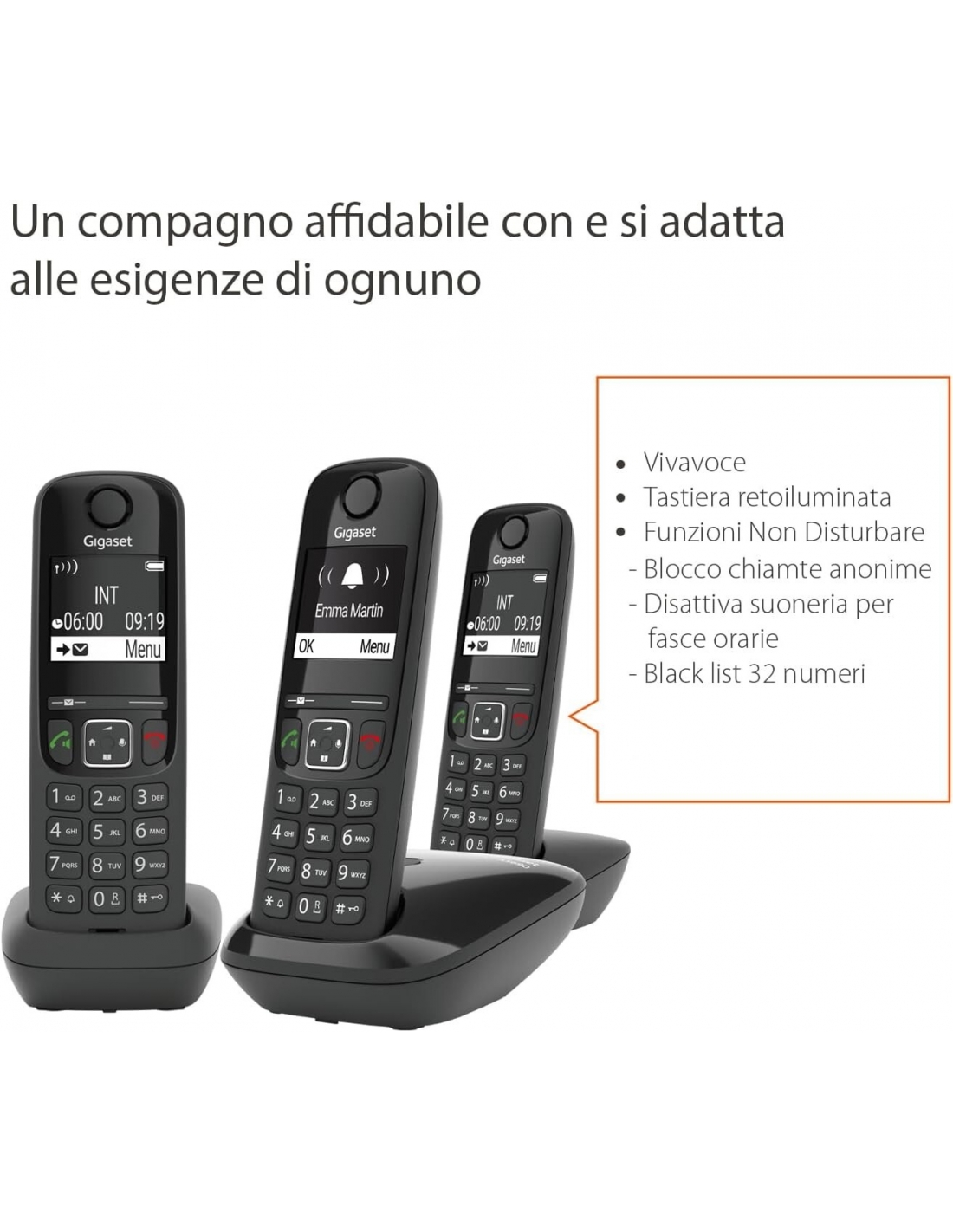 Gigaset AS690 Trio Telefono Cordless: 3 Portatili per Chiamate Interne ed Esterne in Parallelo, Vivavoce Alta Qualità, Tastiera Illuminata ed Ampio Display, Nero [Versione Italiana]