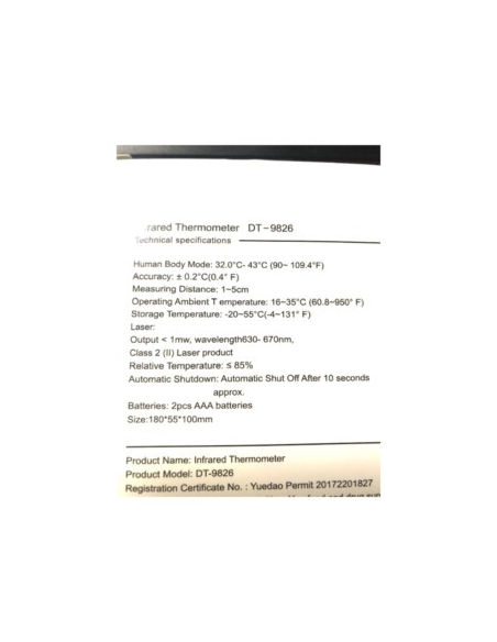 La confezione include: 1 x HALLO DT-9826 termometro a infrarossi senza contatto termica 1 x Manuale per l'utente - Batterie 2xAAA incluse