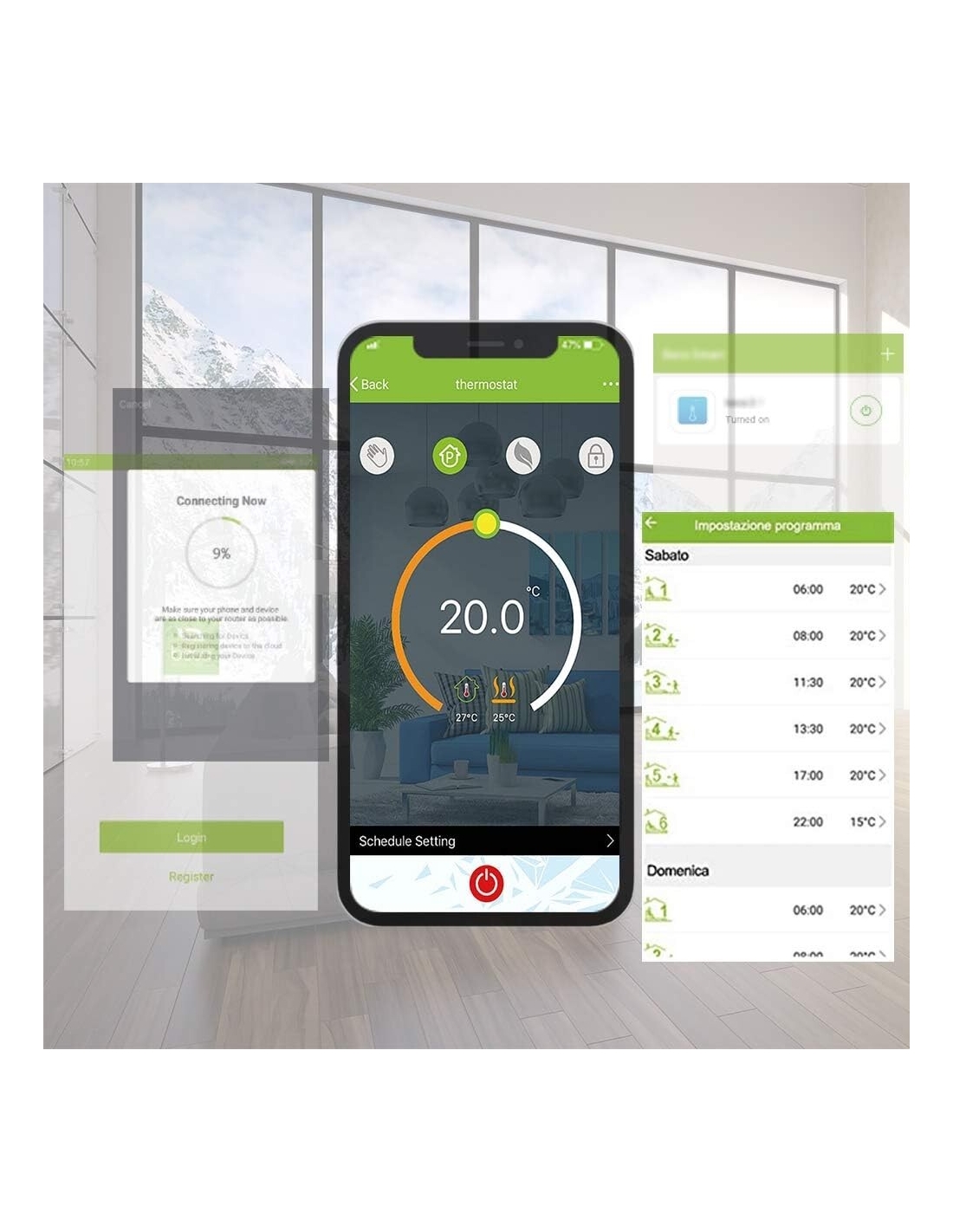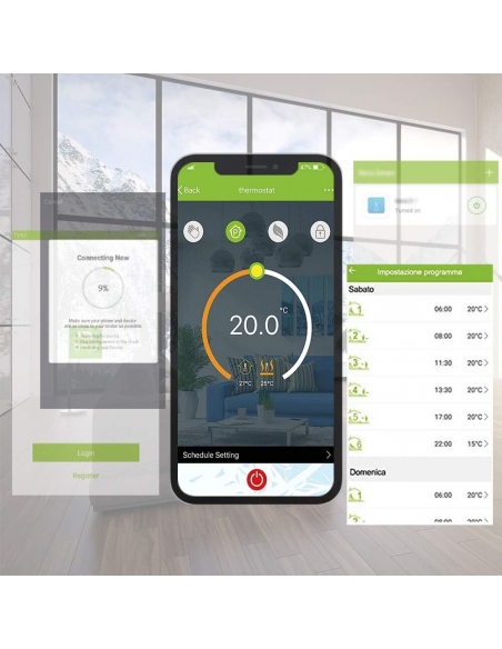 - 5 + 1 + 1 Modalità di programmazione ogni settimana. Nei giorni feriali (dal lunedì al venerdì), sabato, domenica, in diversi momenti della giornata, è possibile impostare la temperatura separatamente per una facile programmazione. Supporta la condivisione dei dispositivi. Termostato la memoria dati incorporata può memorizzare i dati di programmazione senza preoccuparsi di interruzioni di corrente.