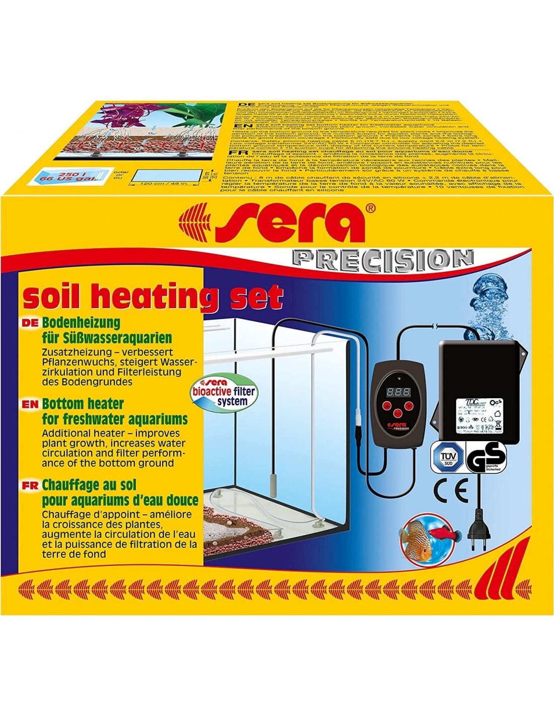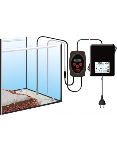 Riscaldamento a pavimento controllato da computer per acquari d'acqua dolce, in combinazione con una barra riscaldante, Sera garantisce un movimento dell'acqua nel terreno grazie a una differenza di temperatura (1 – 2 °C tra la temperatura del suolo e dell'acqua). In questo modo le sostanze nutritive vengono trasportate alle radici delle piante, evitando la formazione di zone di piegatura e il fondo viene utilizzato come filtro aggiuntivo. I valori dell'acqua stabili e la crescita delle piante sono la conseguenza. Il computer di controllo consente una regolazione precisa della temperatura desiderata, una sonda di temperatura misura la temperatura effettiva. Particolarmente sicuro grazie alla tecnologia a bassa tensione. Il kit è composto da: 6 m di cavo di riscaldamento (più cavo di alimentazione da 2,2 m), computer di controllo con sonda di temperatura, 10 supporti a ventosa per una facile installazione sul fondo dell'acquario, trasformatore da 24 V.