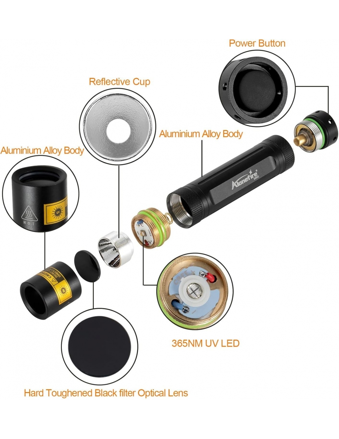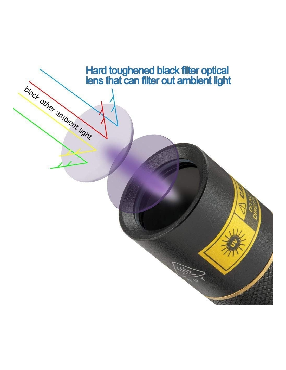 - Utilizza la sorgente LED UV 365NM invece che la lampada a diodo, fino a 10W di consumo energetico e 1200 mW di potenza luminosa, che la rendono una torcia ultravioletta professionale per un uso professionale