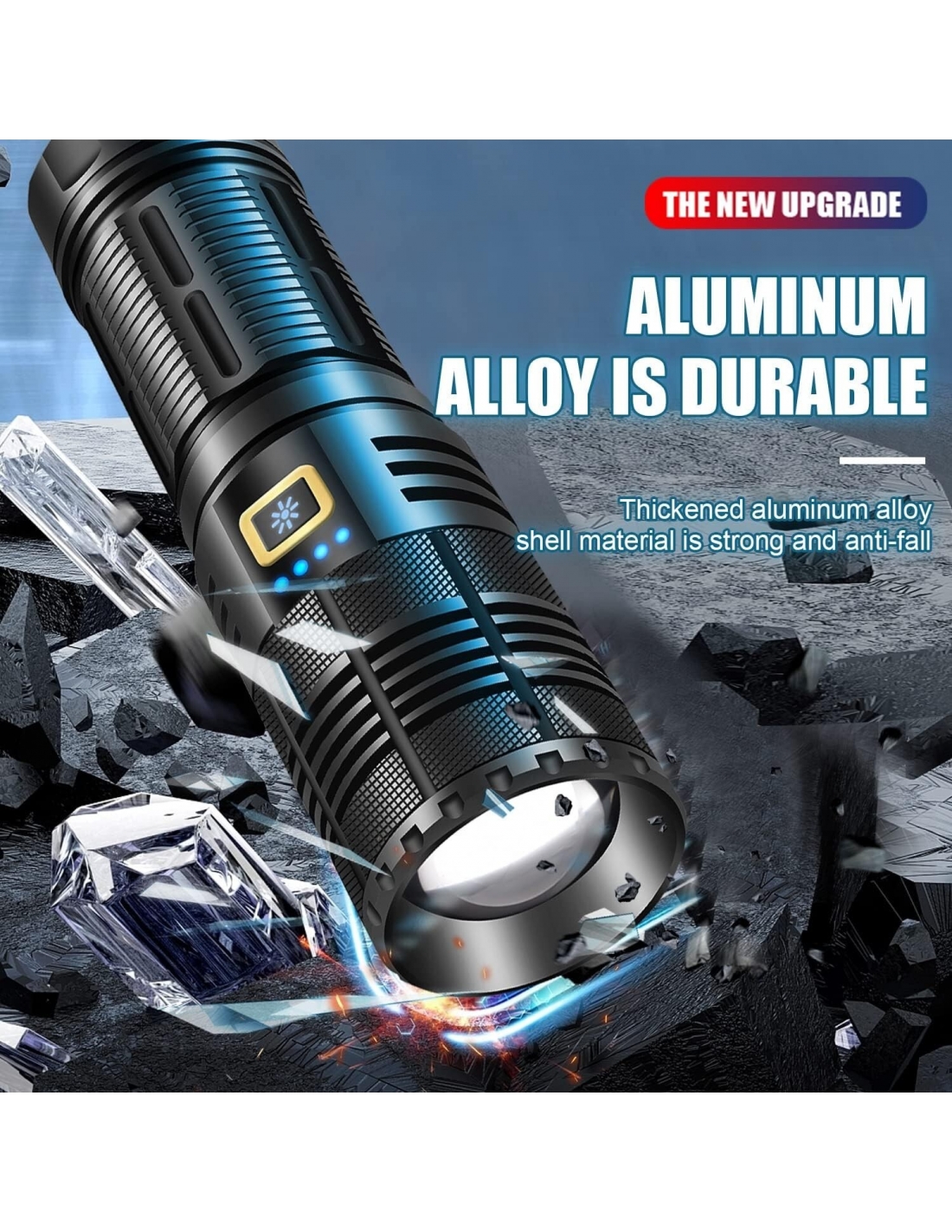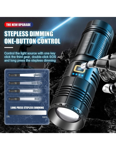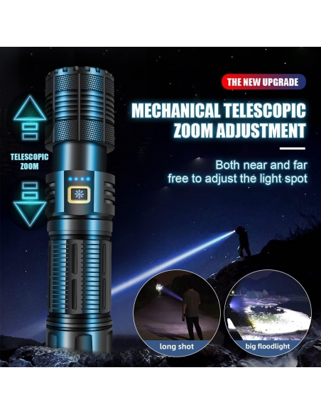 - Questa torcia a LED ultra luminosa utilizza i chip LED più recenti, la luminosità è fino a 100000 lumen, 10 volte più luminosa delle normali torce. Può mettere a fuoco oggetti fino a 1000 metri di distanza anche al buio. Questa torcia a LED è ideale per emergenze, campeggio, escursioni notturne, militari, pesca e caccia.