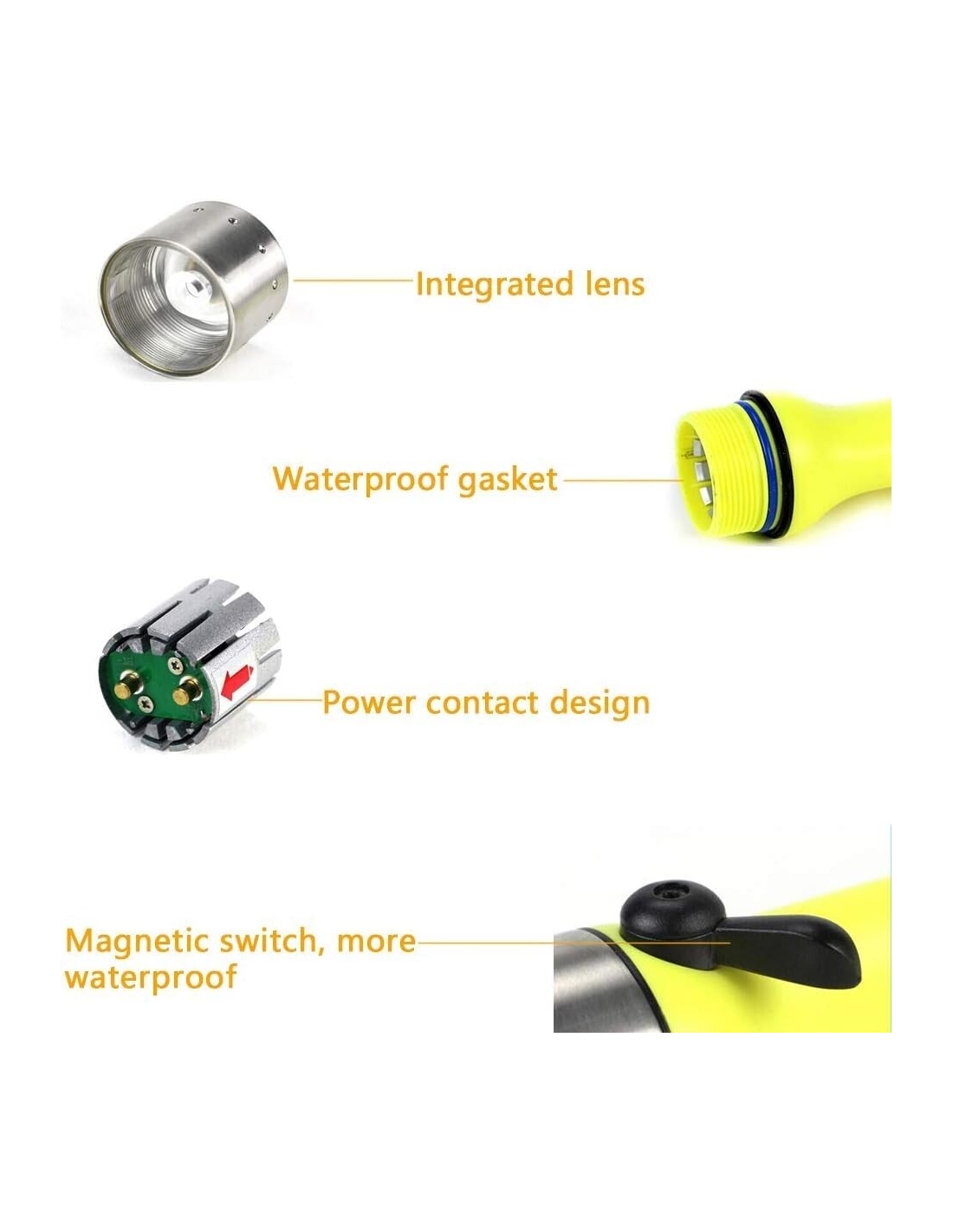 - Versatile: la torcia per immersioni è piccola (16 * 4,3 * 3,5 cm), facile da trasportare, solitamente utilizzata per la pesca notturna, la guida notturna, l'illuminazione da campeggio, l'escursione notturna, l'esplorazione all'aperto e la caccia