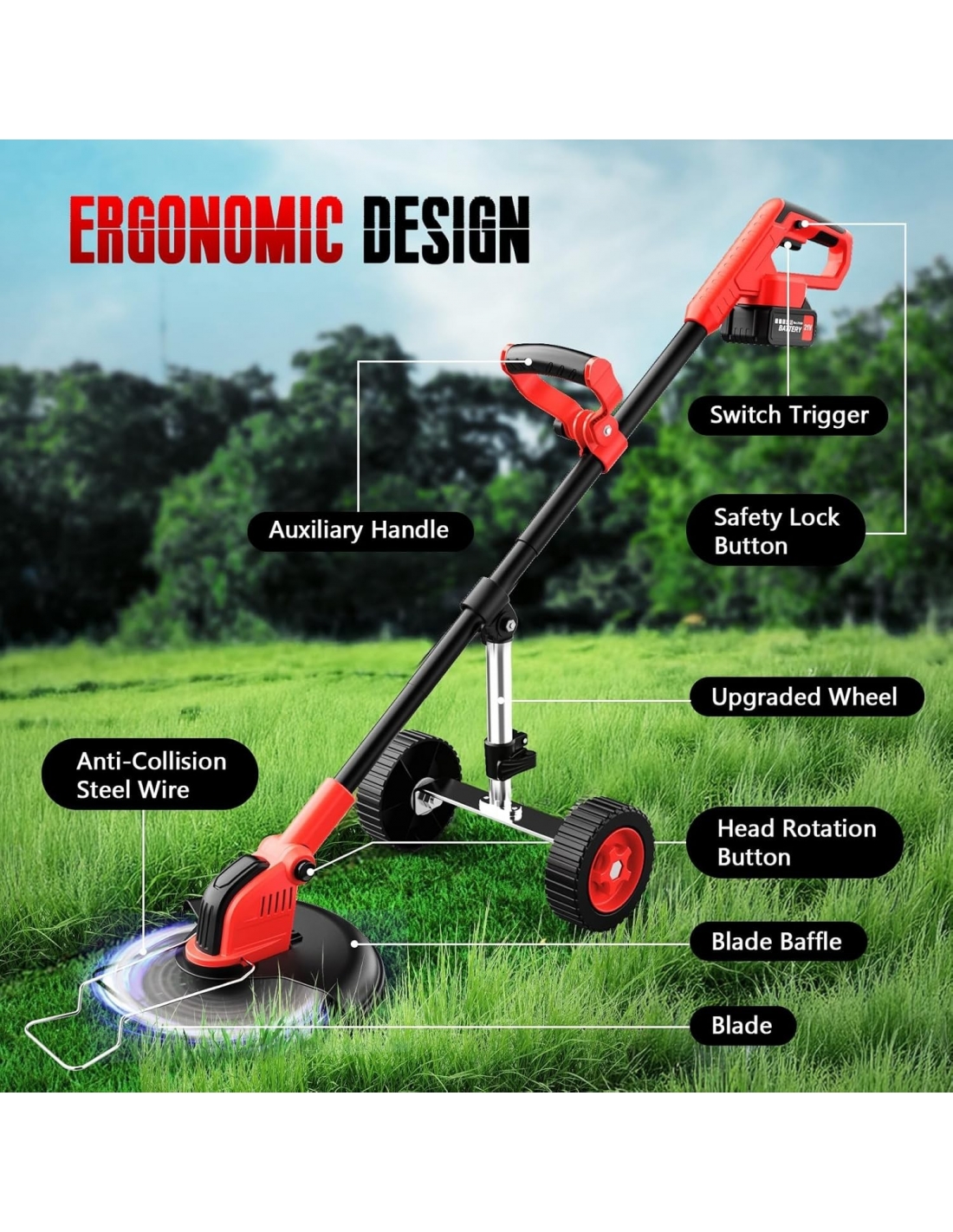 Fovendi Tagliaerba a Batteria da 21 V, Decespugliatore con Spazzola per Erbacce, Manico Elettrico Telescopico da 12 Pollici, con Testa Girevole a 90° e Ruote, Mini Tosaerba con 2 Batterie e Caricatore
