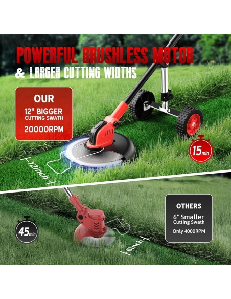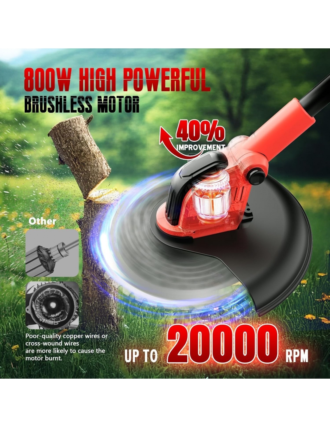 - 【Potente motore brushless】il decespugliatore con batteria e caricabatterie è alimentato da un motore brushless da 800 W che raggiunge una velocità di 20000 giri al minuto, e il decespugliatore offre notevoli prestazioni in un alloggiamento compatto. Motori brushless di alta qualità, noti per la loro lunga durata e basso livello di rumorosità, aumentano la durata e le prestazioni di lavoro del tagliaerba e garantiscono un funzionamento regolare ed efficiente, rendendo la falciatura un gioco da ragazzi.