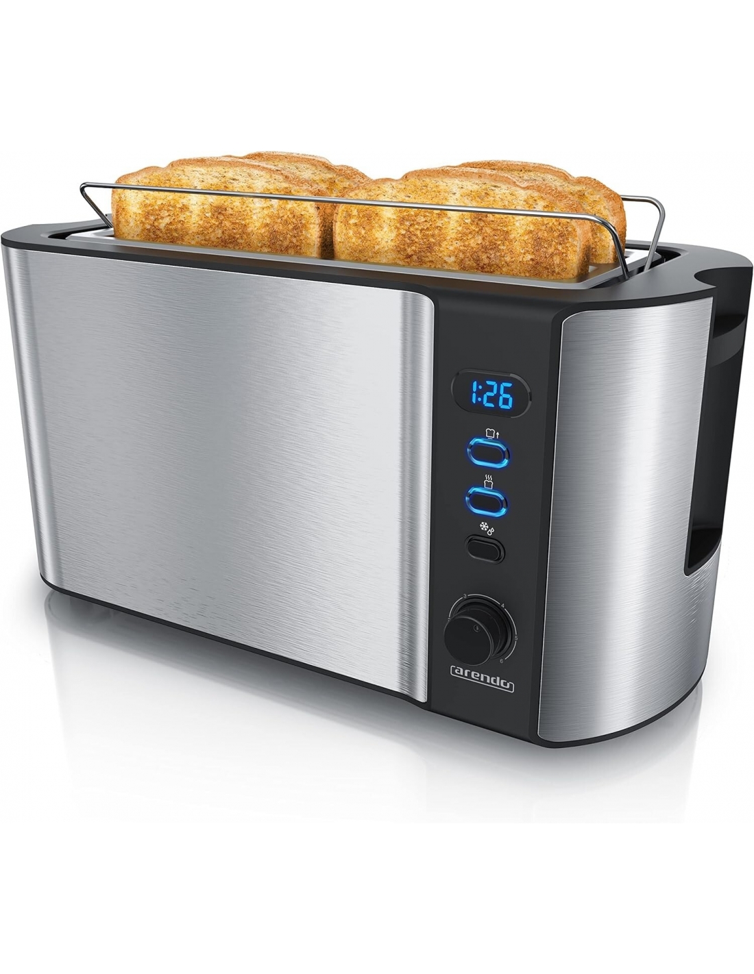 - Dimensioni (senza griglia scaldavivande), A x P x L: 19,5 x 38,5 x 19 cm | Lunghezza cavo: 88 cm / Diametro cavo: 6 mm | Peso: g | Materiale: Plastica e acciaio inox spazzolato | Colore: Acciaio | Contenuto della confezione: Arendo Frukost tostapane a 4 fette in acciaio inox con fessura lunga + manuale utente (ENG, GER, FRA, ITA, ESP) NB: 4 fette: i nostri tostapane sono ottimizzati per l'uso delle due dimensioni standard comunemente utilizzate: American Sandwich Toast: 11,0 x 11,0 x 1,2 cm Regular Toast: 9,0 x 9,5 x 1,3 cm