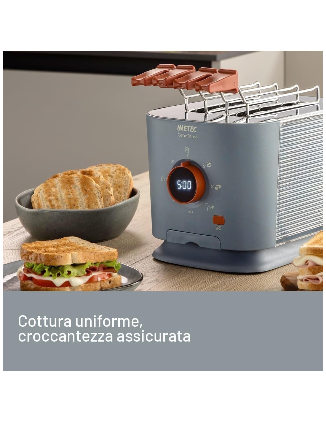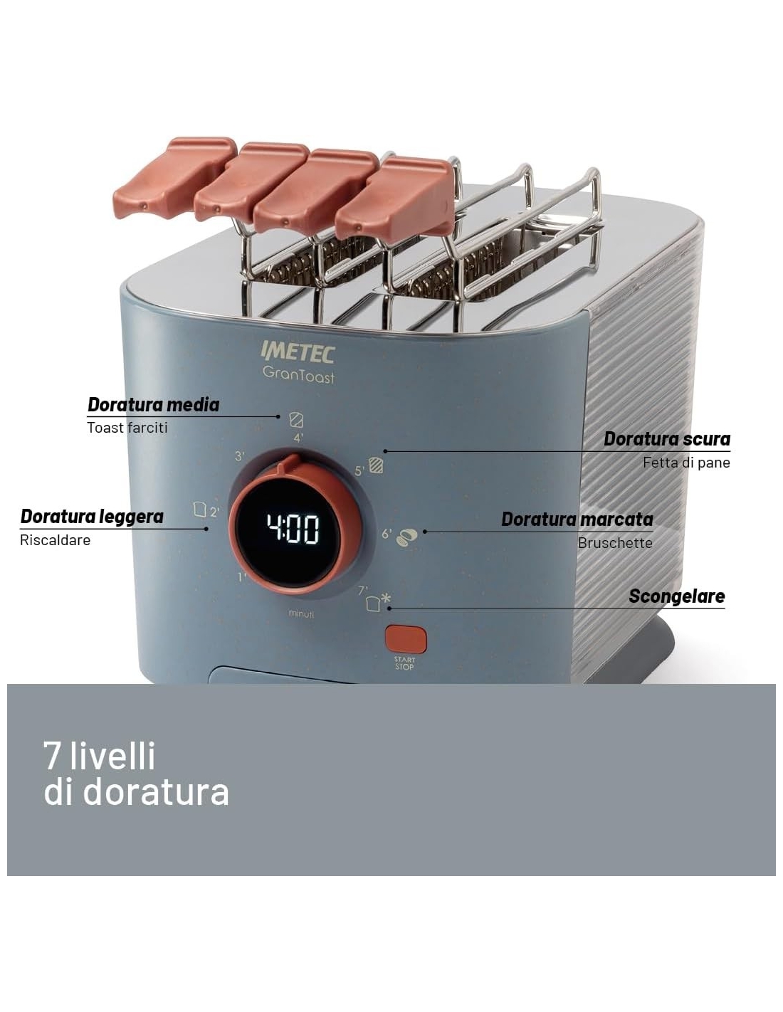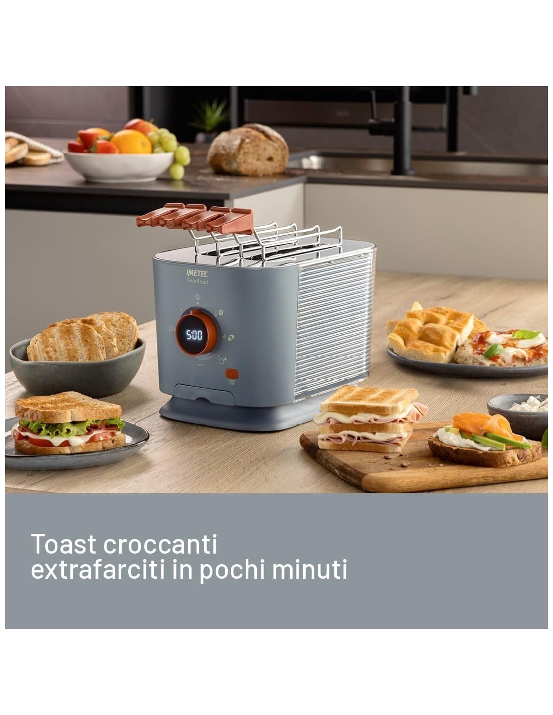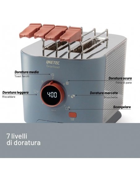 Imetec Grantoast - Tostapane 2 Fette XL con Pinze Apribili per Toast Farciti - 7 Livelli Doratura, Facile Pulizia, Display LED, Griglia Scalda Brioche, Pizzette e Focacce, Timer Digitale, Acciaio Inox