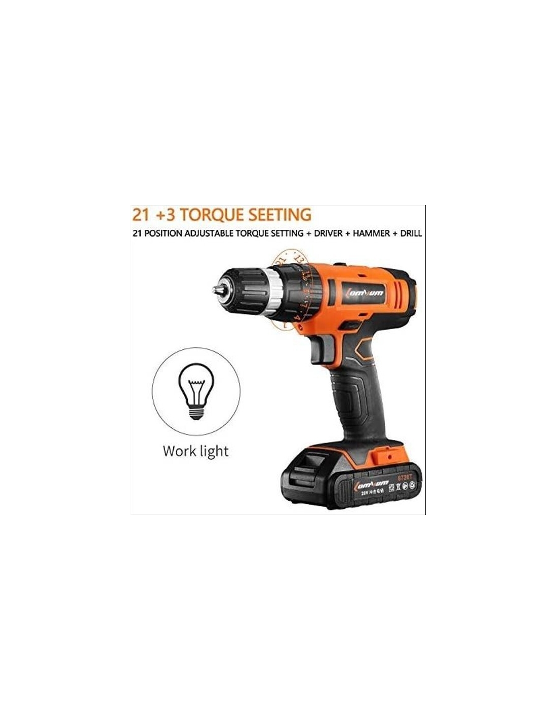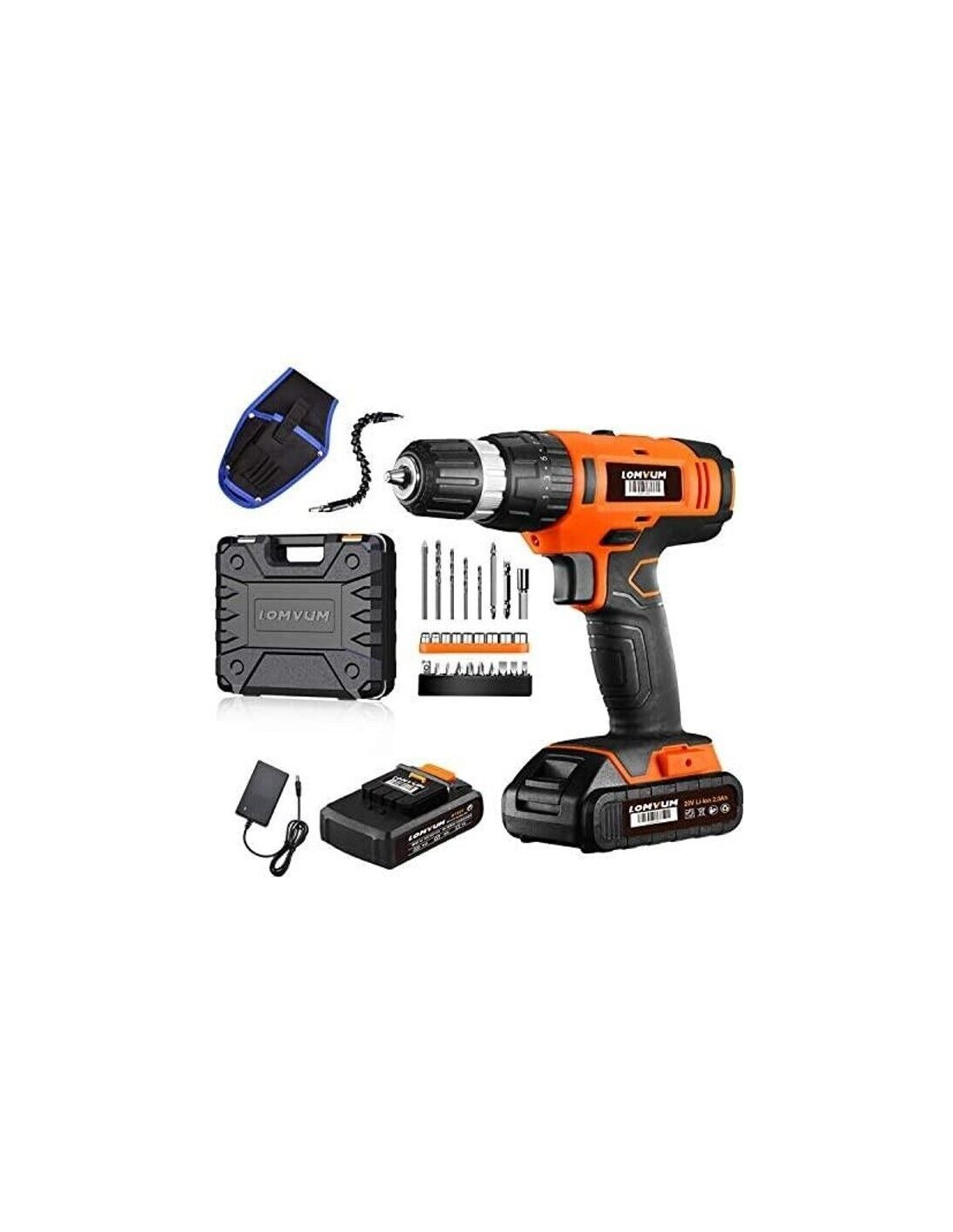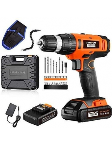 Informazioni su questo articolo 3 MODALITÀ DI LAVORO: Trapano, Martello e Cacciavite. L'interruttore a velocità variabile consente una perforazione pilota fluida seguita da una perforazione rapida alla massima velocità; Le opzioni a 2 marce consentono velocità di foratura alte/basse, fornendo potenza ottimale per la maggior parte delle applicazioni su un'ampia gamma di materiali. TRAPANO POTENTE: con la funzione martello, questo trapano può sfondare materiali più resistenti, la capacità di foratura è di 4 mm-10 mm, la coppia 21 (coppia massima 33 N.m) può essere regolata per fornire la potenza ottimale necessaria per le attività di avvitamento e perforazione. BATTERIA DA 20 V 2,0 Ah: la ricarica di 1 ora mantiene la carica completa, è in grado di eseguire un gran numero di cicli di carica e scarica, rendendola una pratica aggiunta per risparmiare tempo a qualsiasi casa. Senza cavi ingombranti che si aggrovigliano o intralciano, questo trapano offre mobilità e maneggevolezza ottimali per le riparazioni domestiche fai-da-te. DESIGN ERGONOMICO: luce LED brillante per un'illuminazione ottimale delle aree di lavoro buie; Pulsante putter reversibile che consente di azionare con una sola mano; L'impugnatura rivestita in gomma antiscivolo offre una sensazione di presa comoda ma stabile senza fatica per il lavoro quotidiano. PACCHETTO INCLUSO: 1 * Trapano, 2 * Batteria agli ioni di litio da 2,0 Ah, 1 * Custodia compatta, 27 * Accessori, 1 * Albero flessibile universale, 1 * Marsupio