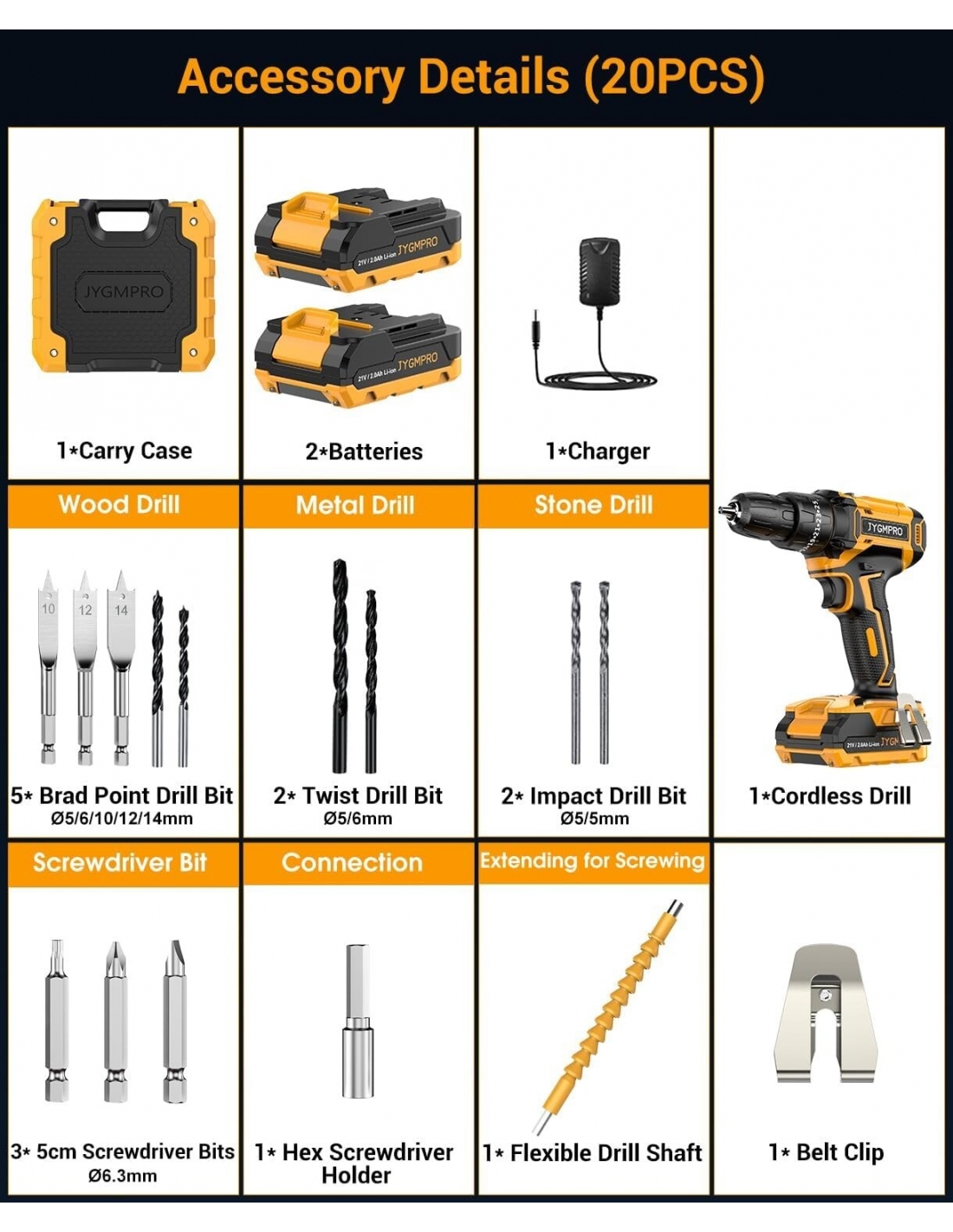 - 【Materiali di qualità superiore】 Il set di trapano aggiornato JYGMPRO utilizza nuovi materiali e fornisce accessori più durevoli, viene fornito con trapano a batteria * 1, batteria da 2,0 Ah * 2, caricabatterie * 1, custodia per il trasporto * 1, manuale utente * 1, punte elicoidali * 5, punte elicoidali in ossido * 2, punte per trapano a percussione * 2, punte cacciavite * 3, albero trapano flessibile * 1, supporto per cacciavite esagonale * 1, clip da cintura * 1.