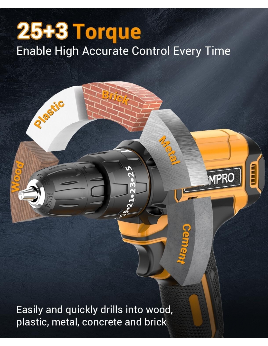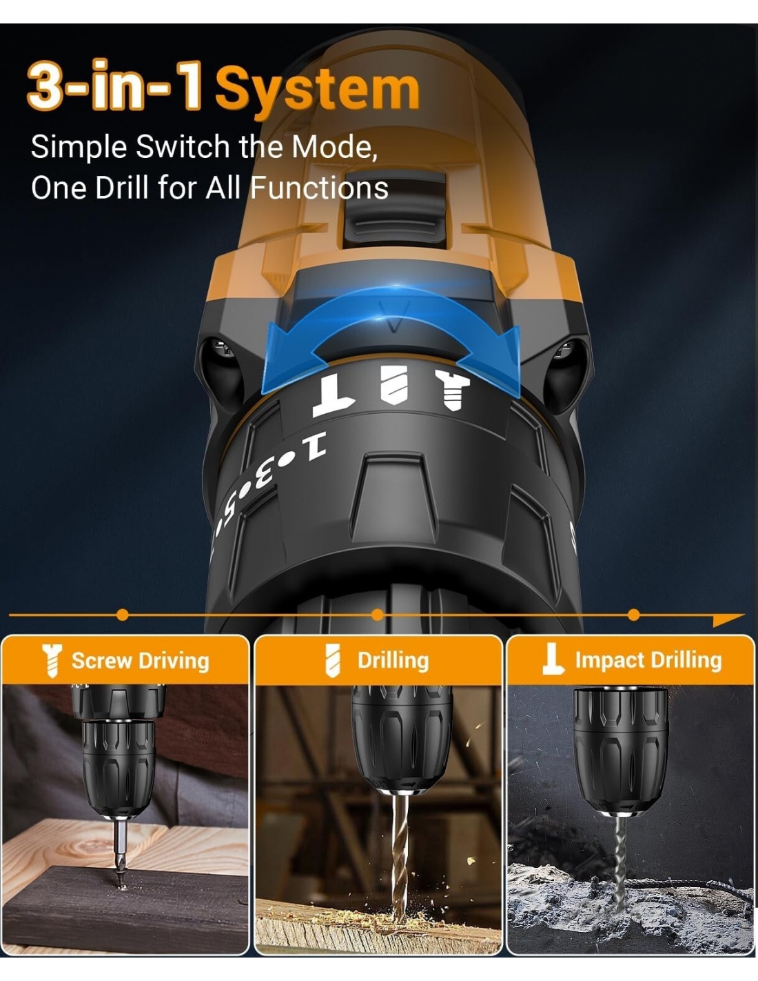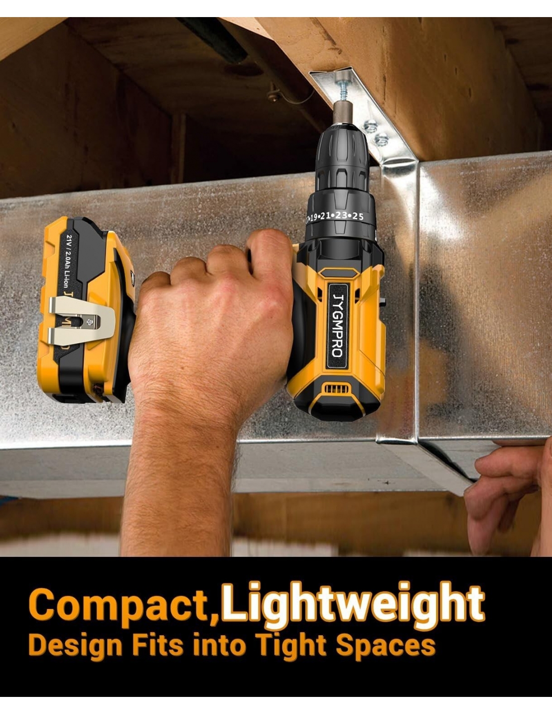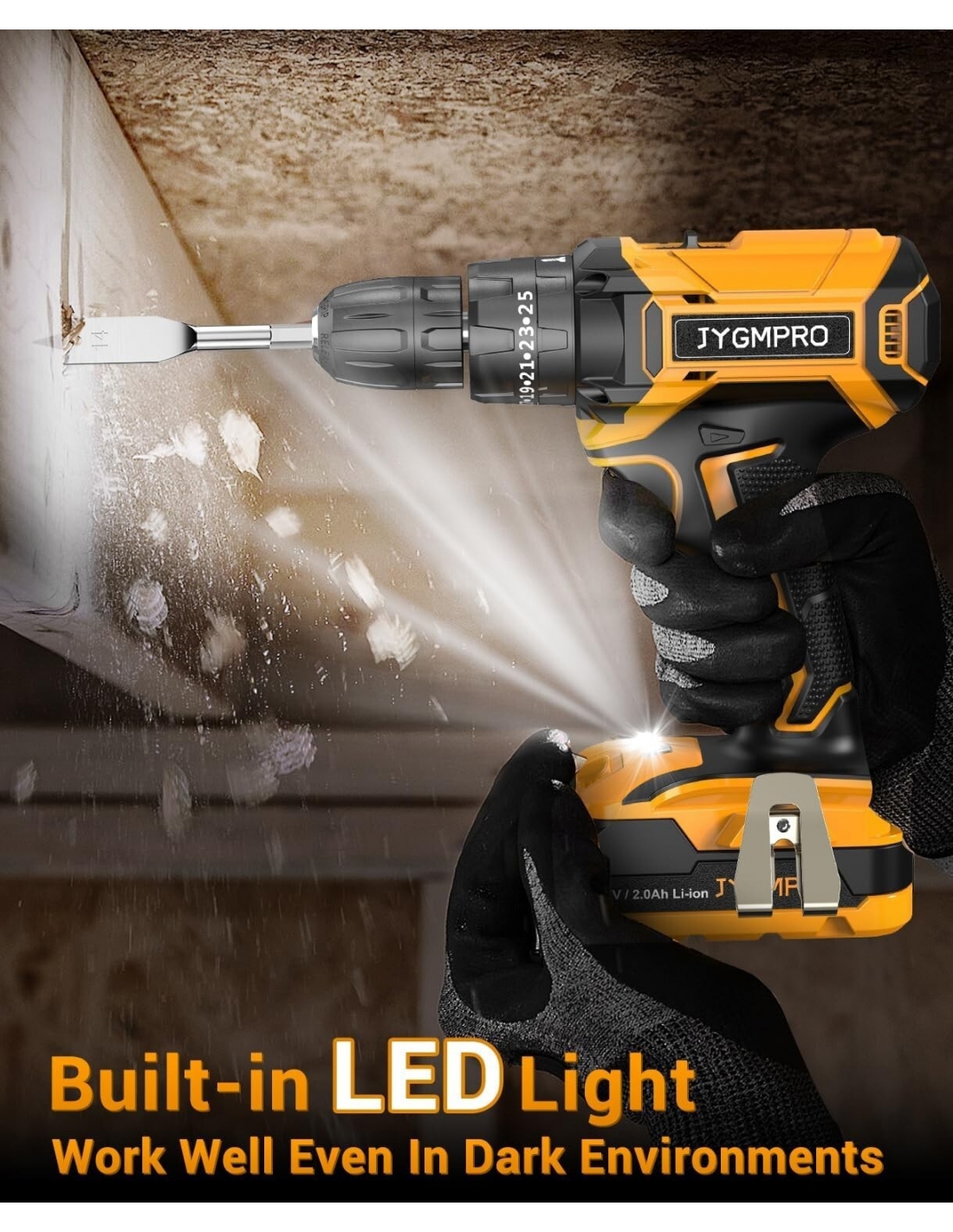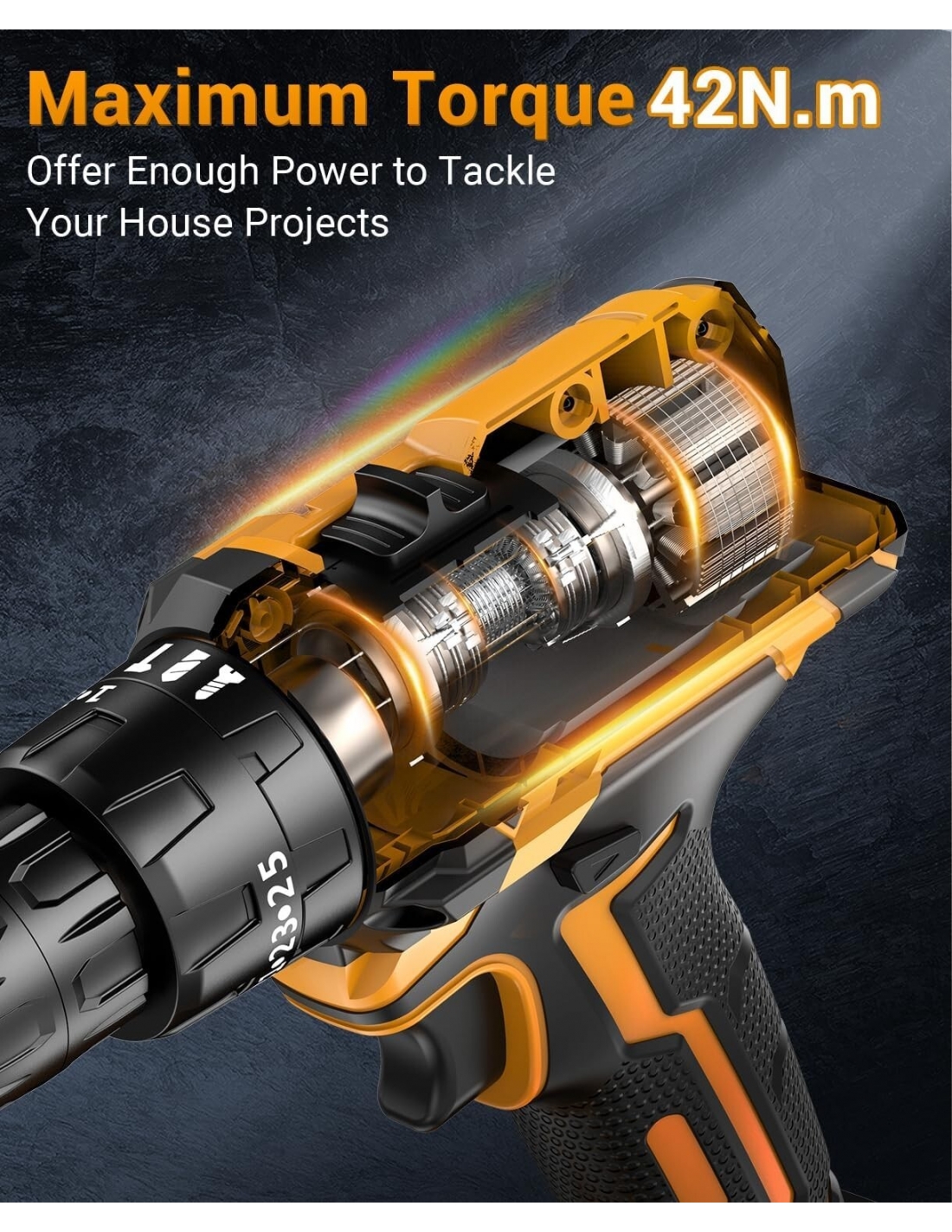 - 【Trapano a percussione 3 in 1 con coppia di 42Nm】Il trapano avvitatore a batteria JYGMPRO ha tre modalità di lavoro: avvitamento, perforazione e perforazione a percussione. Con una coppia massima di 42Nm, il trapano combinato può facilmente soddisfare un'ampia gamma di esigenze di perforazione e avvitamento su legno, metallo e plastica. Il trapano avvitatore a batteria è perfetto sia per il fai-da-te che per gli artigiani esperti.