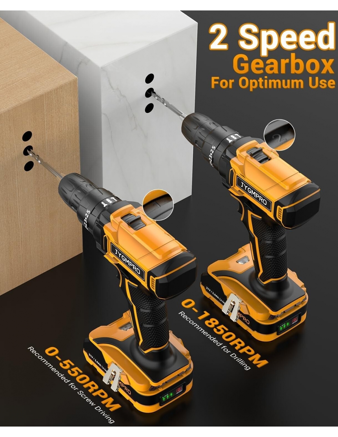 - 【2 velocità variabili e frizione a 25 posizioni】Il trapano avvitatore a percussione può essere impostato per funzionare a due diverse gamme di velocità (0-550 RPM, 0-1850 RPM), così avrai sempre la potenza di cui hai bisogno. Inoltre, l'avvitatore ha 25 posizioni di coppia per la regolazione del mandrino, fornendo un'operazione più precisa per la foratura e l'avvitamento.