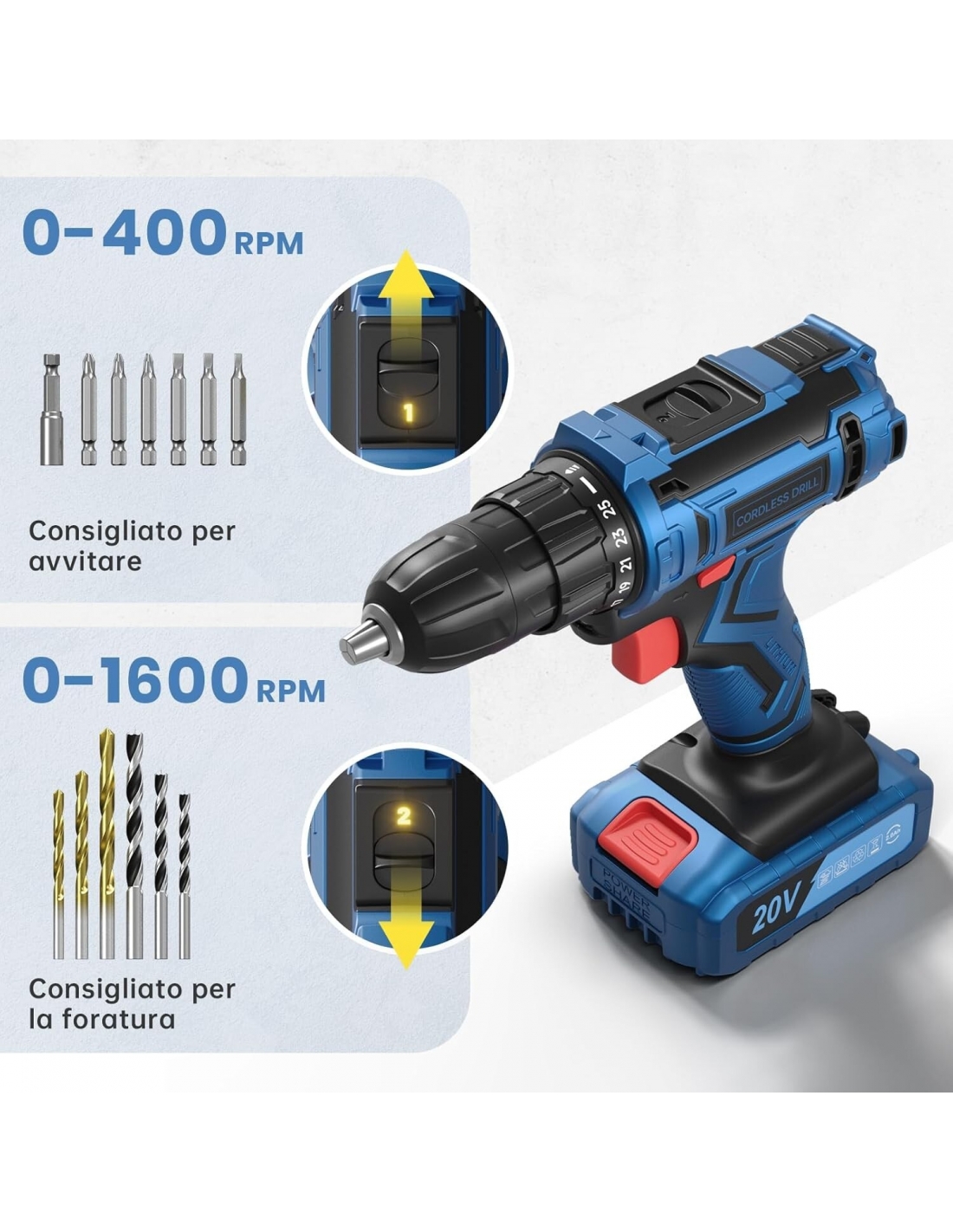 FAHEFANA Avvitatore a Batteria, Trapano Avvitatore Batteria, 20V 2.0Ah Trapano, 25+1 Trapani Avvitatori Elettrico, 75 Accessori, 2 Velocità, LED Luce, Adatto per Riparazioni Domestiche, Fai da te, Regali