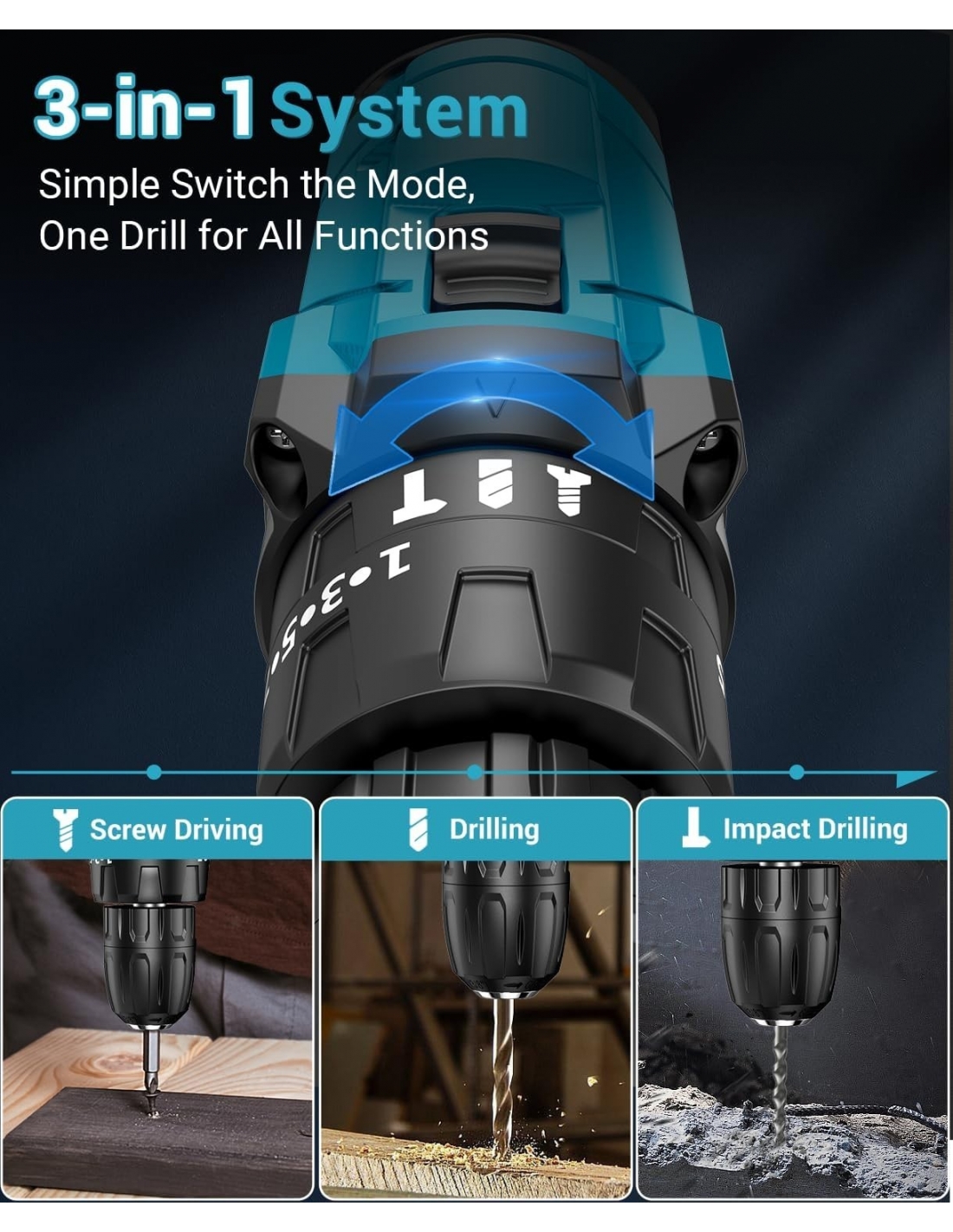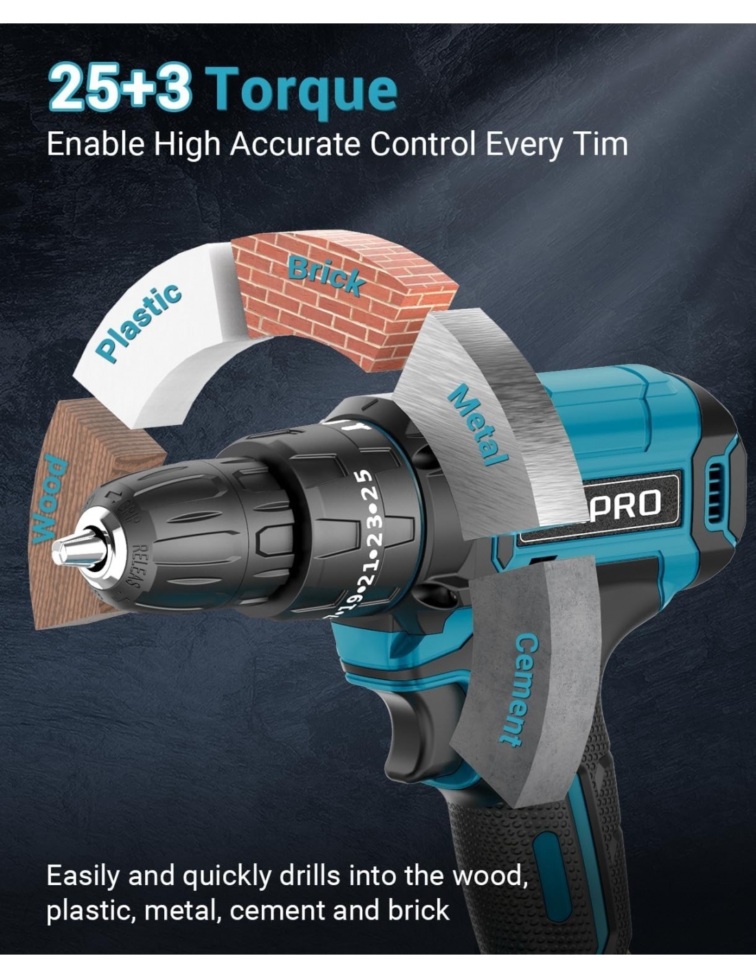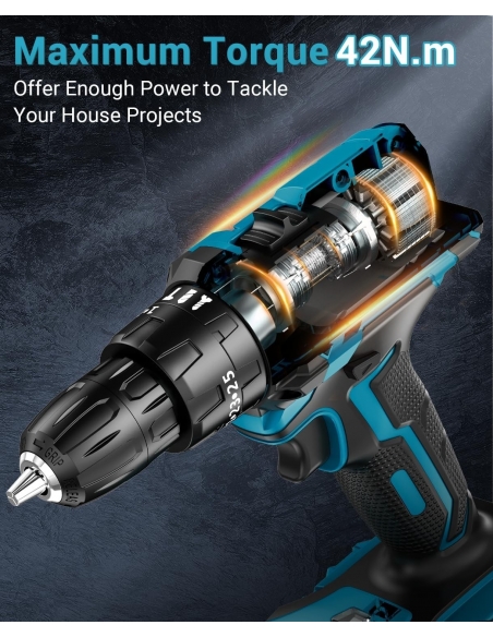 - 【2 velocità variabili e frizione a 25 posizioni】Il trapano avvitatore a percussione può essere impostato per funzionare a due diverse gamme di velocità (0-550 RPM, 0-1850 RPM), così avrai sempre la potenza di cui hai bisogno. Inoltre, l'avvitatore ha 25 posizioni di coppia per la regolazione del mandrino, fornendo un'operazione più precisa per la foratura e l'avvitamento.
