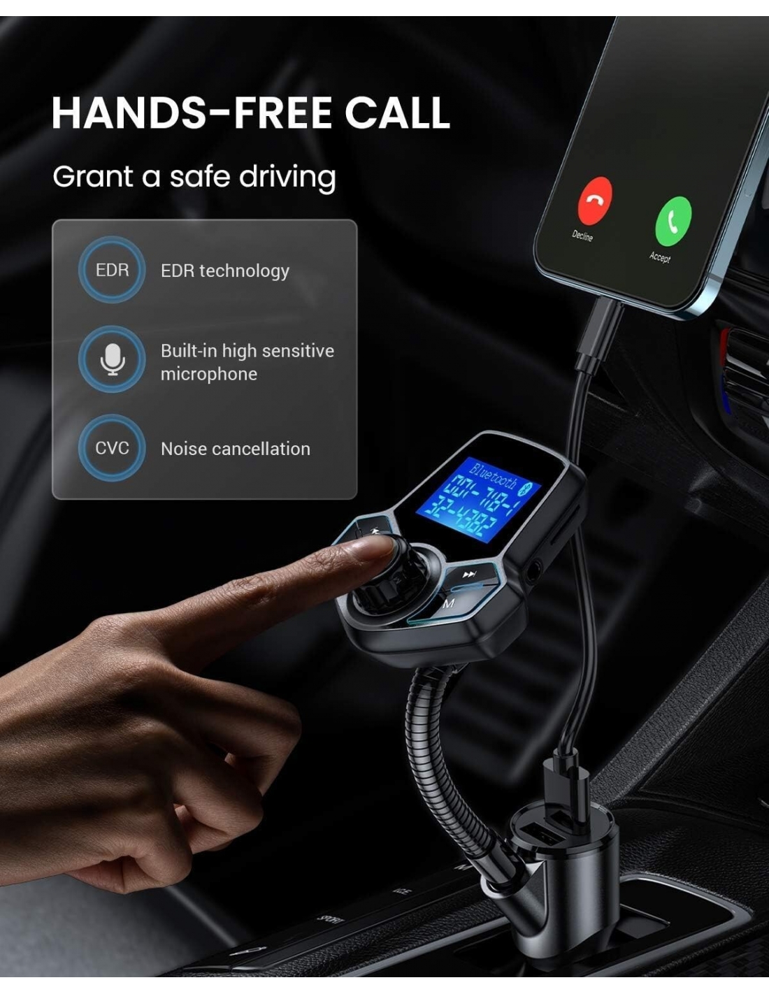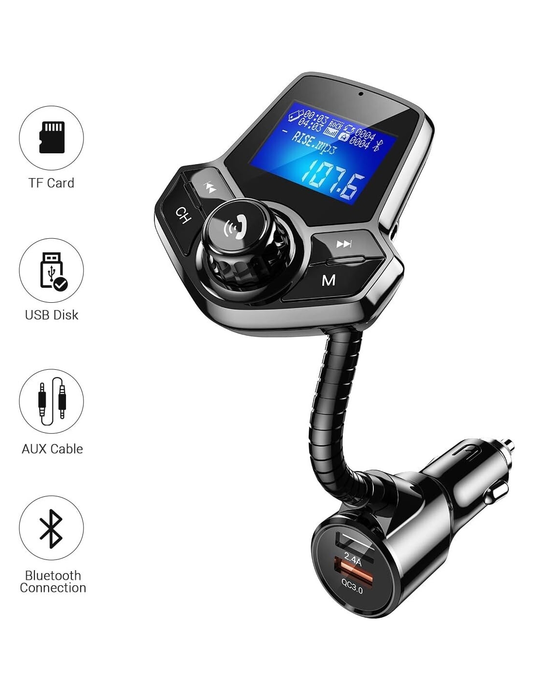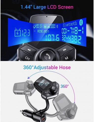 Compatibilità universale: trasmissione FM e funzione di spegnimento del display per interrompere il consumo di energia dalla batteria dell'auto. Il design compatto e discreto lo rende facile da inserire nella maggior parte dei tipi di prese accendisigari per auto da 12 V/24 V.