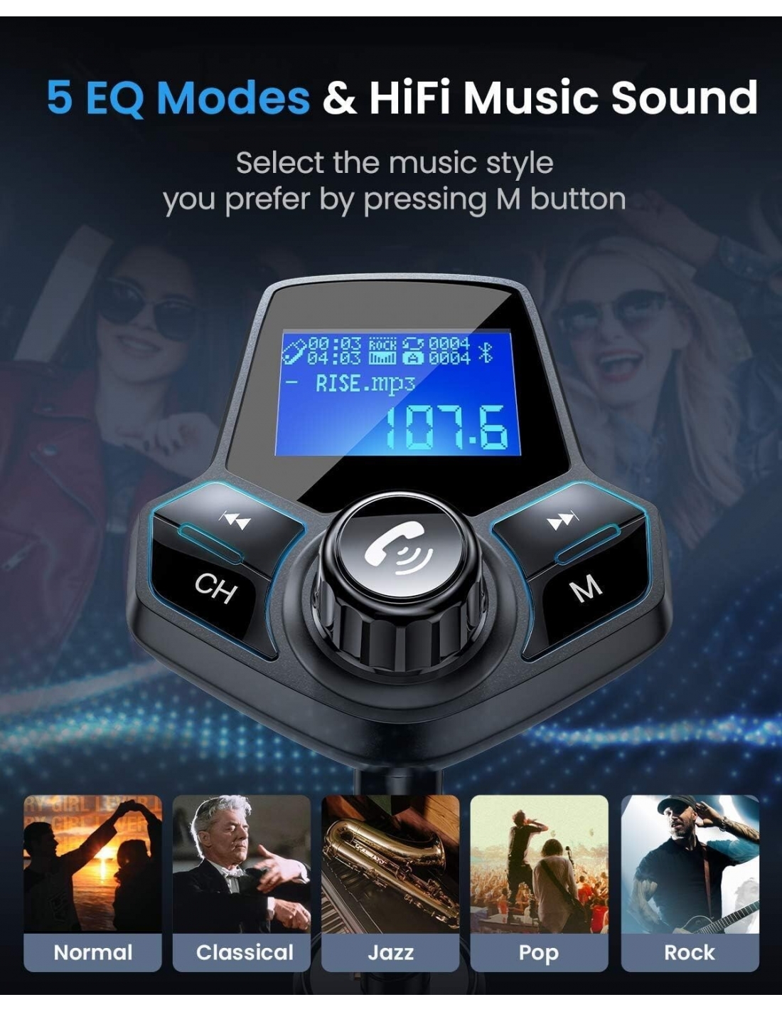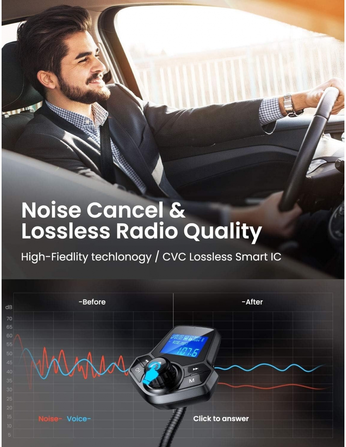 Qualità del suono cristallina: il lettore MP3 per auto utilizza la tecnologia CVC per la riduzione delle interferenze e del rumore per creare una qualità del suono full duplex sia per lo streaming di musica che per le chiamate. Microfono integrato altamente sensibile con anti-interferenza, prestazioni audio migliorate e cancellazione dell'eco e del rumore