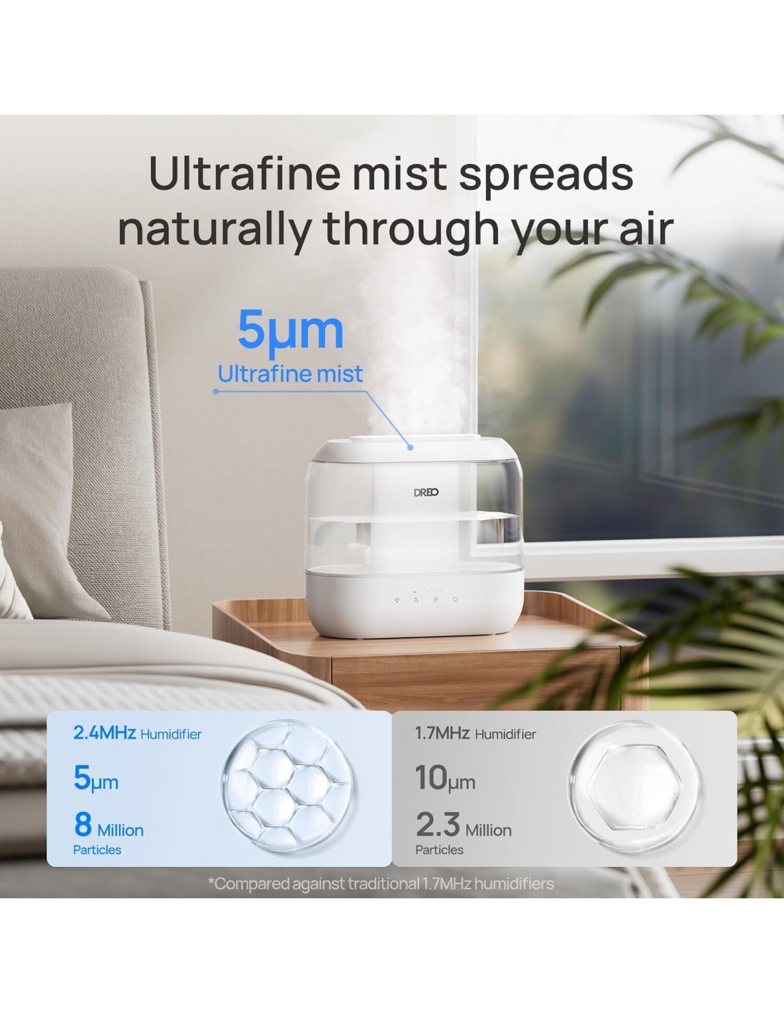 - Porta freschezza a tutto tondo: Grazie al processo di atomizzazione ad alta frequenza, questo umidificatore per la casa rilascia una nebbia ultrafine di 5μm e particelle di nebbia più leggere, consentendo all'umidità di diffondersi uniformemente in tutta la stanza senza bagnare le superfici.