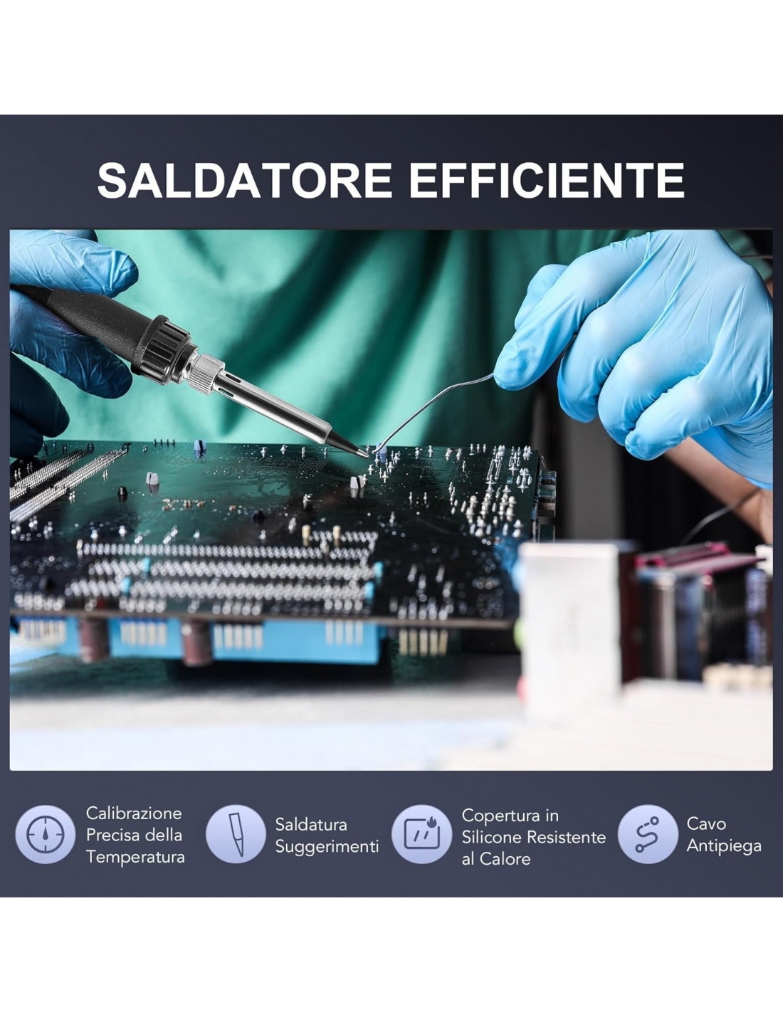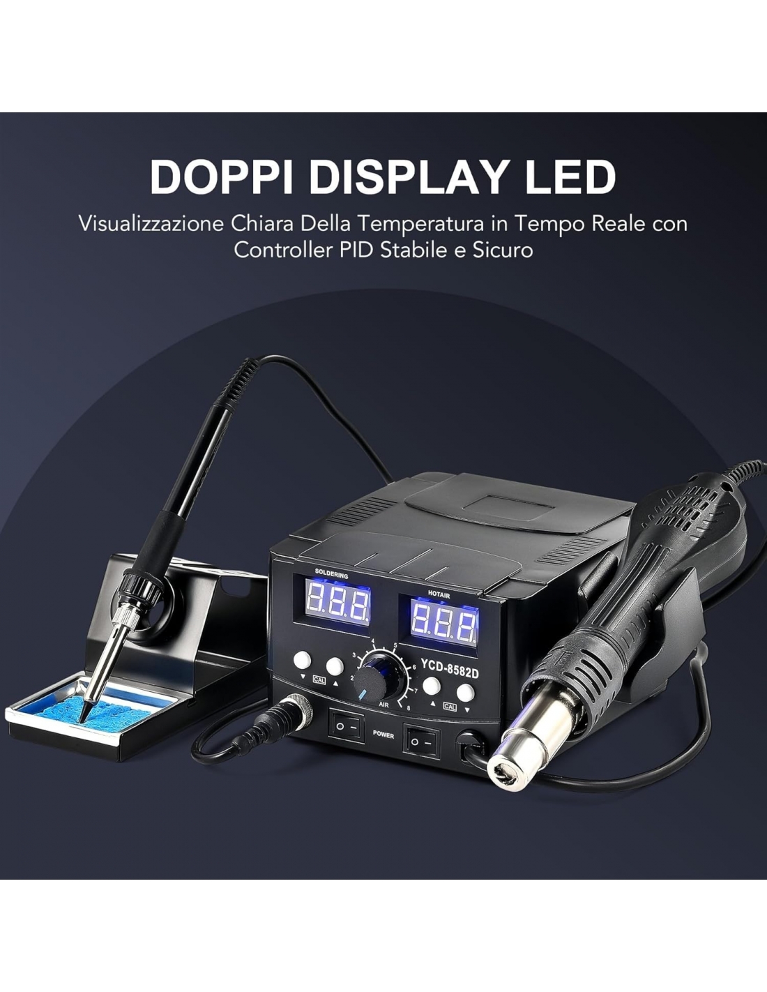 - La temperatura può essere regolata per essere più accurata utilizzando il pulsante del volume con doppio controllo. I doppi schermi a LED mostrano separatamente la temperatura del saldatore e della saldatura ad aria calda.