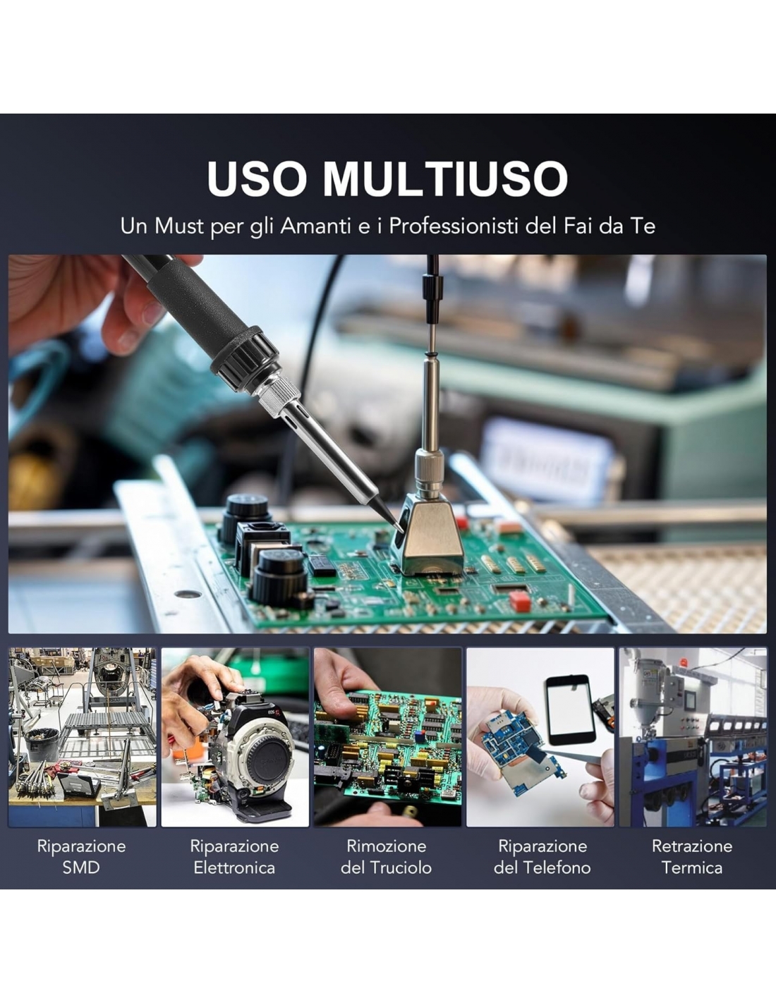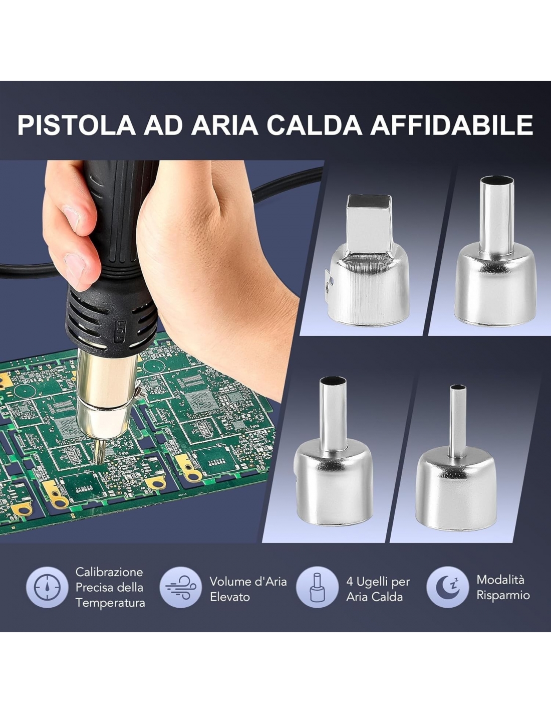 - La funzione di saldatura e standby dell'aria calda accelera il processo di riparazione. Ad esempio, c'è un sensore nel supporto della saldatura ad aria calda e la saldatura ad aria calda si riscalda immediatamente quando la raccogli. Quando si inserisce la saldatura nel supporto, si raffredda.