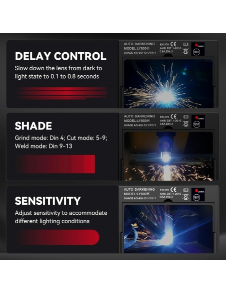 - Oscuramento automatico più veloce: aggiorna le lenti auto-oscuranti di fascia alta con 4 sensori ad arco premium, passando dalla luce al buio in 1/25000 sec. Regola facilmente l'ombra e la sensibilità delle lenti per diversi ambienti di lavoro, perfetto per saldatura STICK/MIG/TIG, rettifica e taglio. Livello di stato oscuro: 4/5-8/9-13.