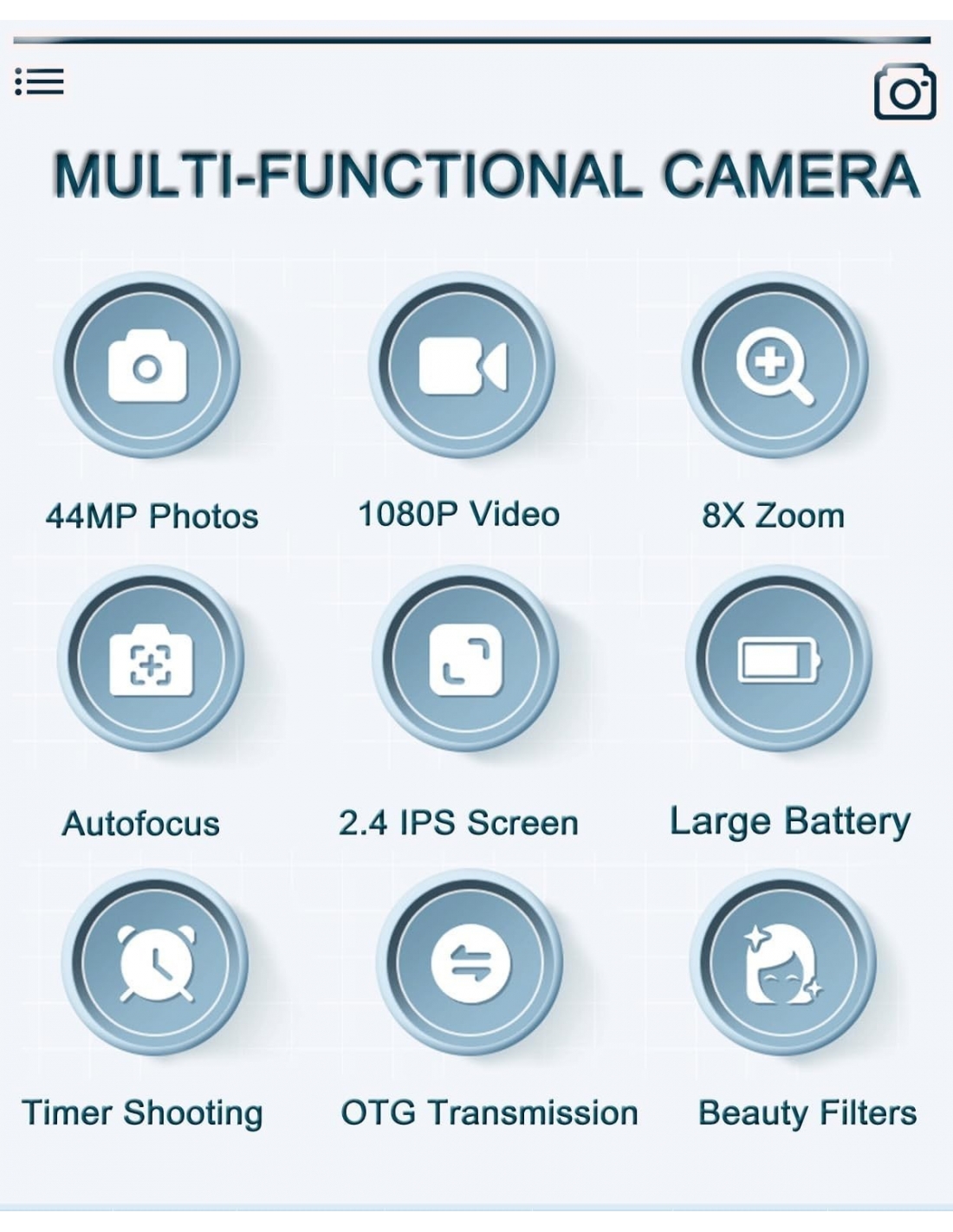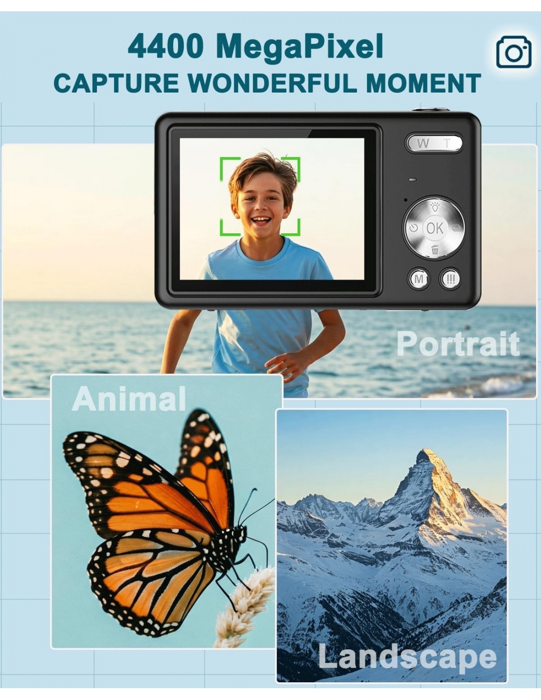 - 【Piccola fotocamera digitale】Inizia a fotografare facilmente! Questa semplice fotocamera digitale è dotata di un potente sensore CMOS per splendide foto da 44 MP e video FHD 1080P di alta qualità. Inoltre, l'anti-shake digitale aiuta a ridurre la sfocatura causata dal movimento della fotocamera, rendendo semplice per i principianti scattare foto nitide e chiare.